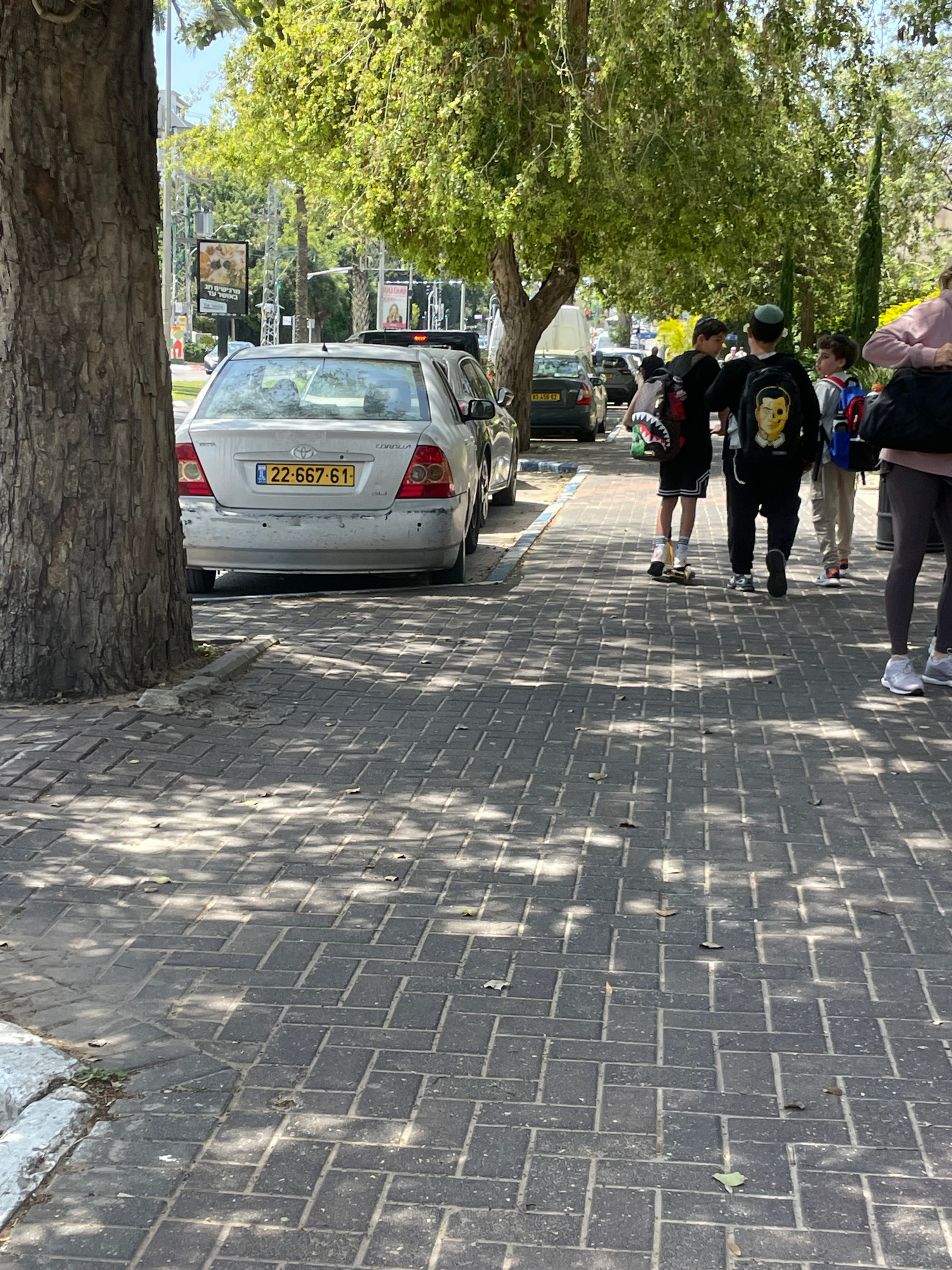 The image shows a street scene in Raanana, Israel, featuring a parked silver Toyota Corolla with the license plate 22-667-61. A group of people, including a skateboarder, are walking along the sidewal…read more