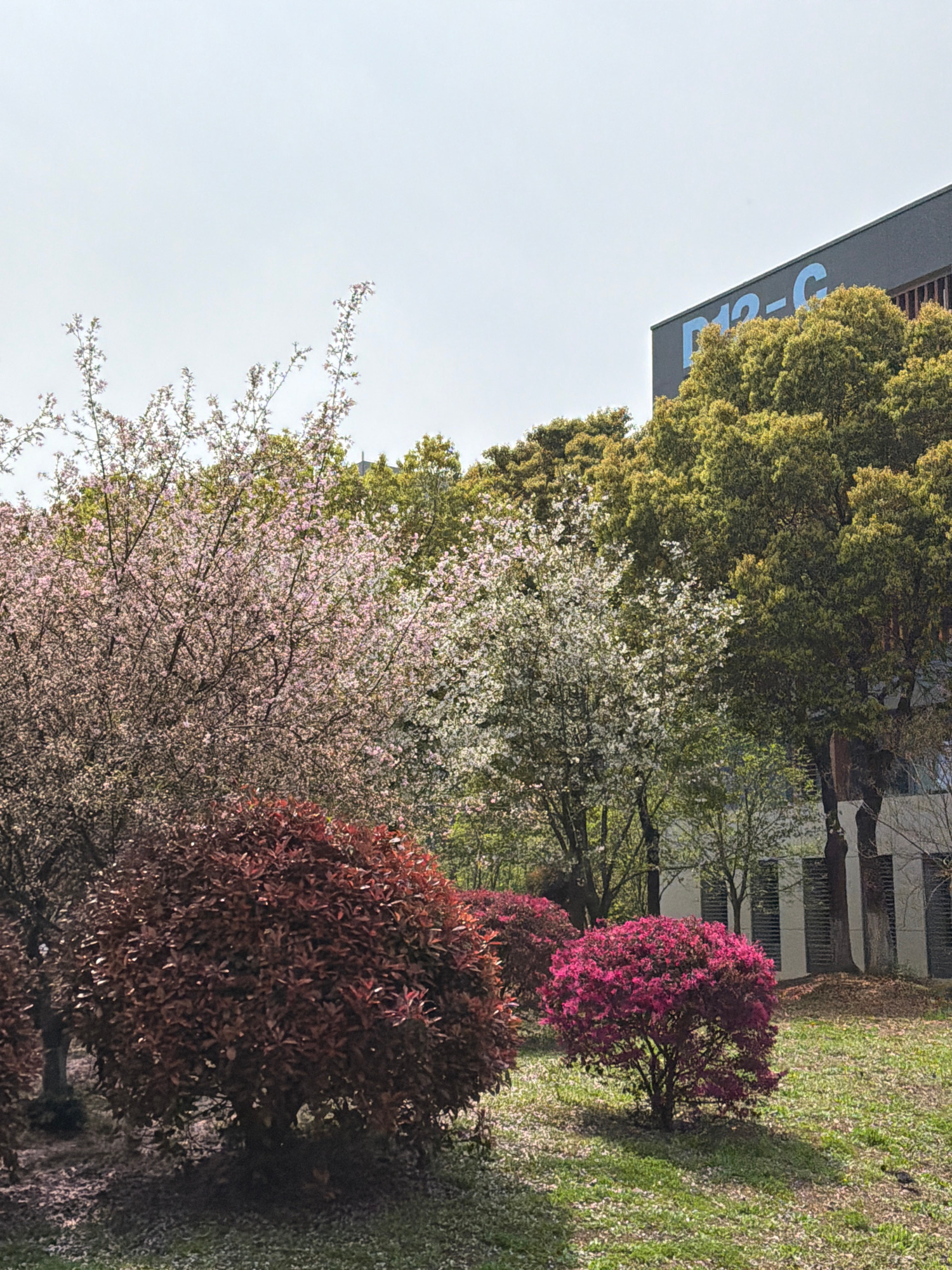 The image shows a scene in Jiangning District, China. In the foreground are trees in bloom with pink and white blossoms. To the right are reddish and pink bushes. A building can be seen in the backgro…read more