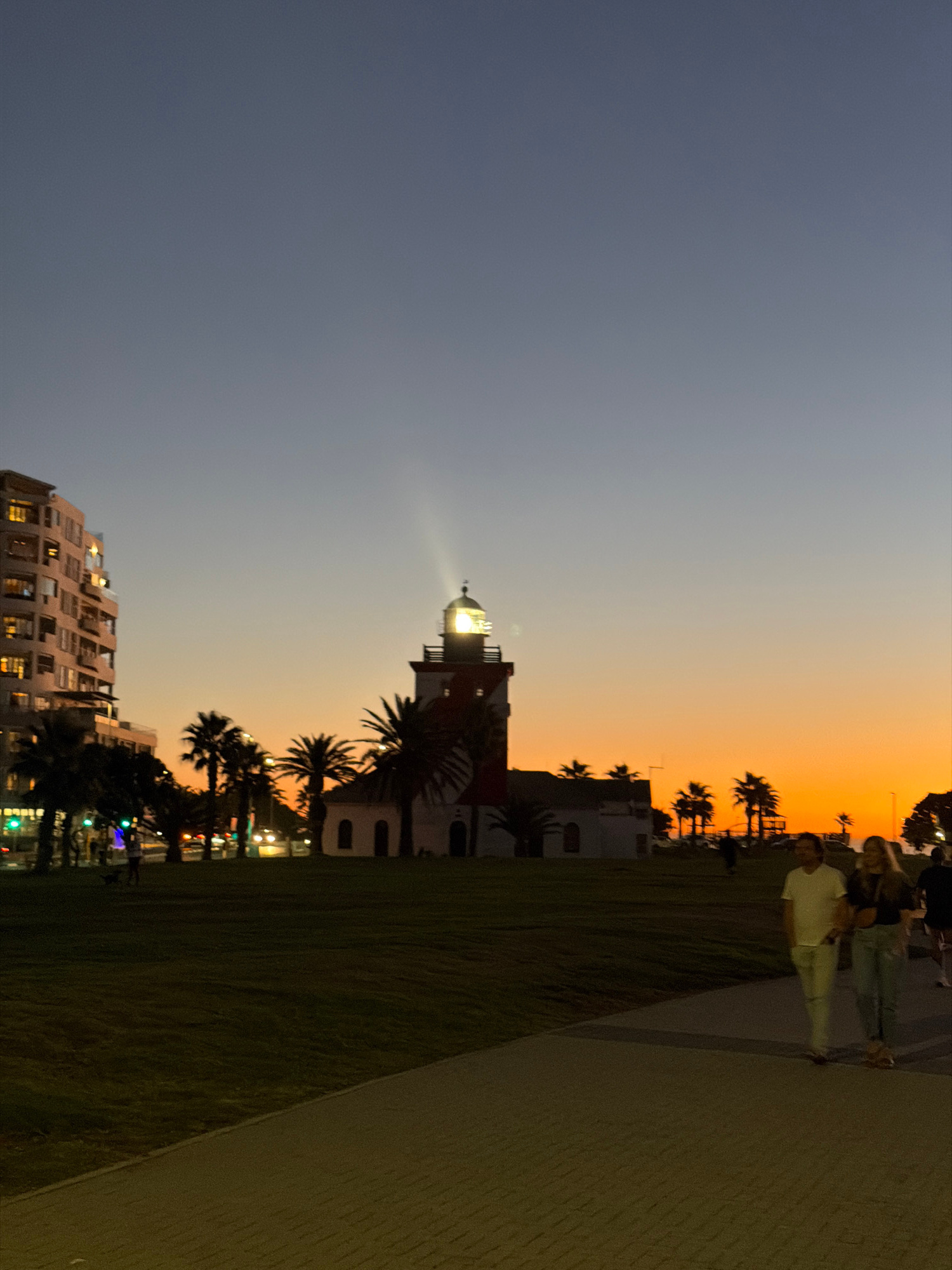 The photograph captures a scene at dusk in Cape Town, South Africa, featuring the Mouille Point Lighthouse. The lighthouse, with its illuminated beacon, is centrally positioned amidst palm trees and a…read more