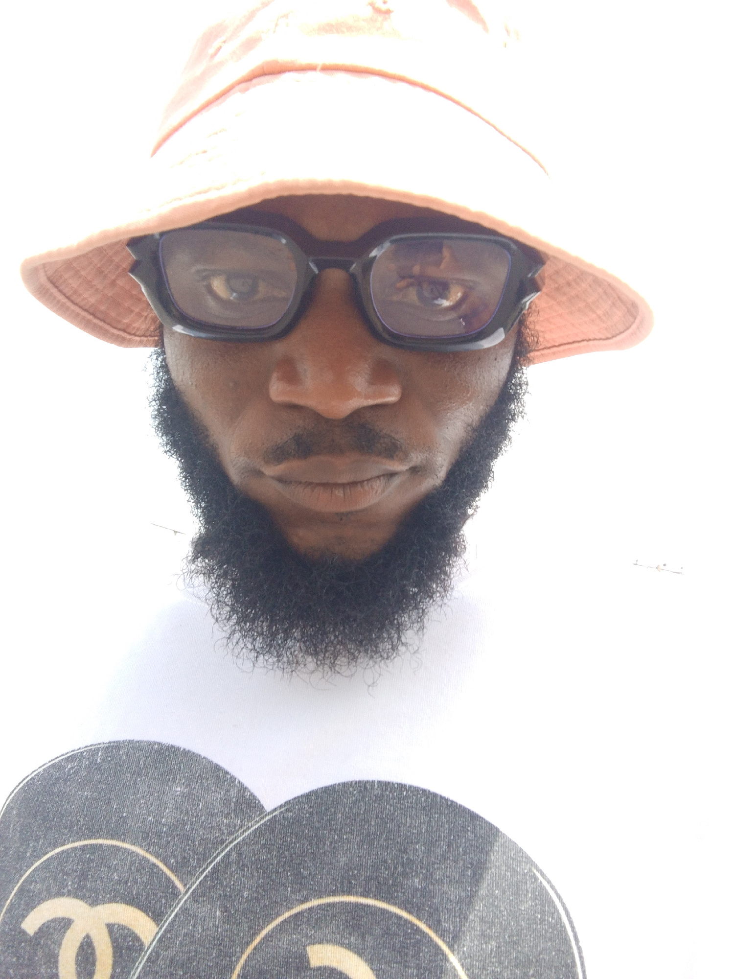 A close-up photograph shows a person with dark skin wearing a light orange bucket hat and black-framed eyeglasses. The individual has a thick, dark beard. The person is wearing a white t-shirt with tw…read more