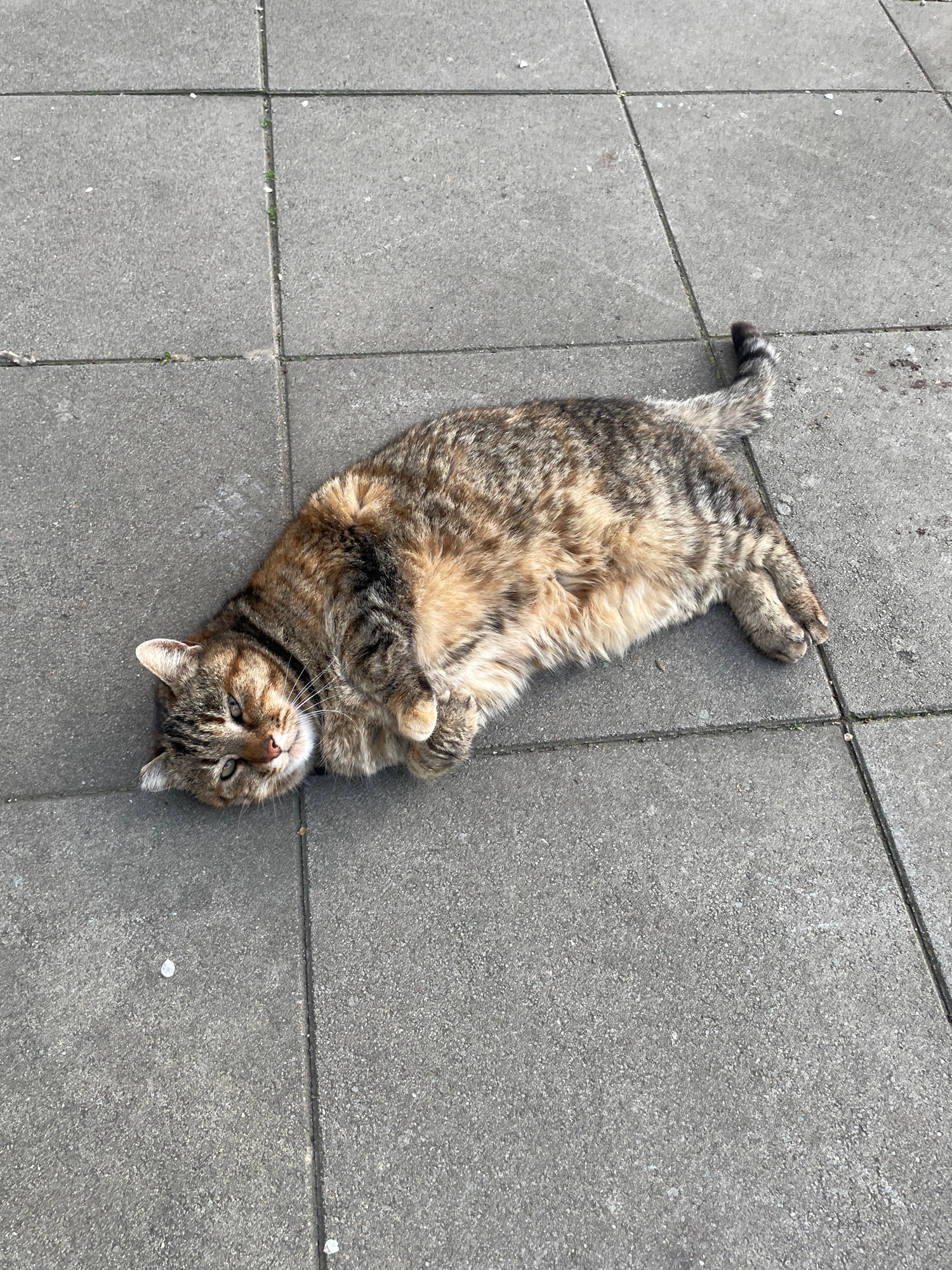 A tabby cat lies on its back on a gray tiled surface. The cat's paws are curled upwards near its chest. The cat is looking up towards the camera. The background is a tiled street surface. The image wa…read more