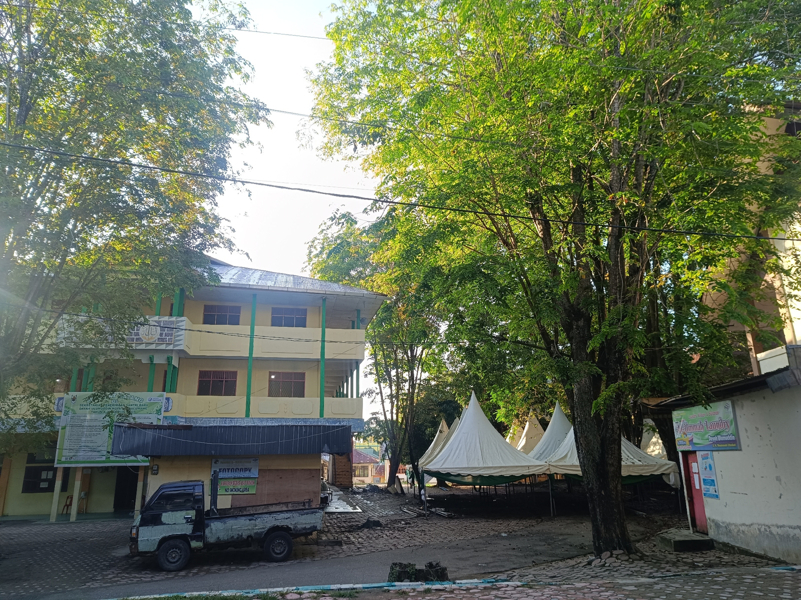 The image depicts an outdoor scene in Lhokseumawe, Indonesia, featuring a three-story yellow and green building with a sign indicating it is the "SEKRETARIAT PENERIMAAN SANTRI BARU DAYAH ULUMUDDIN KOT…read more