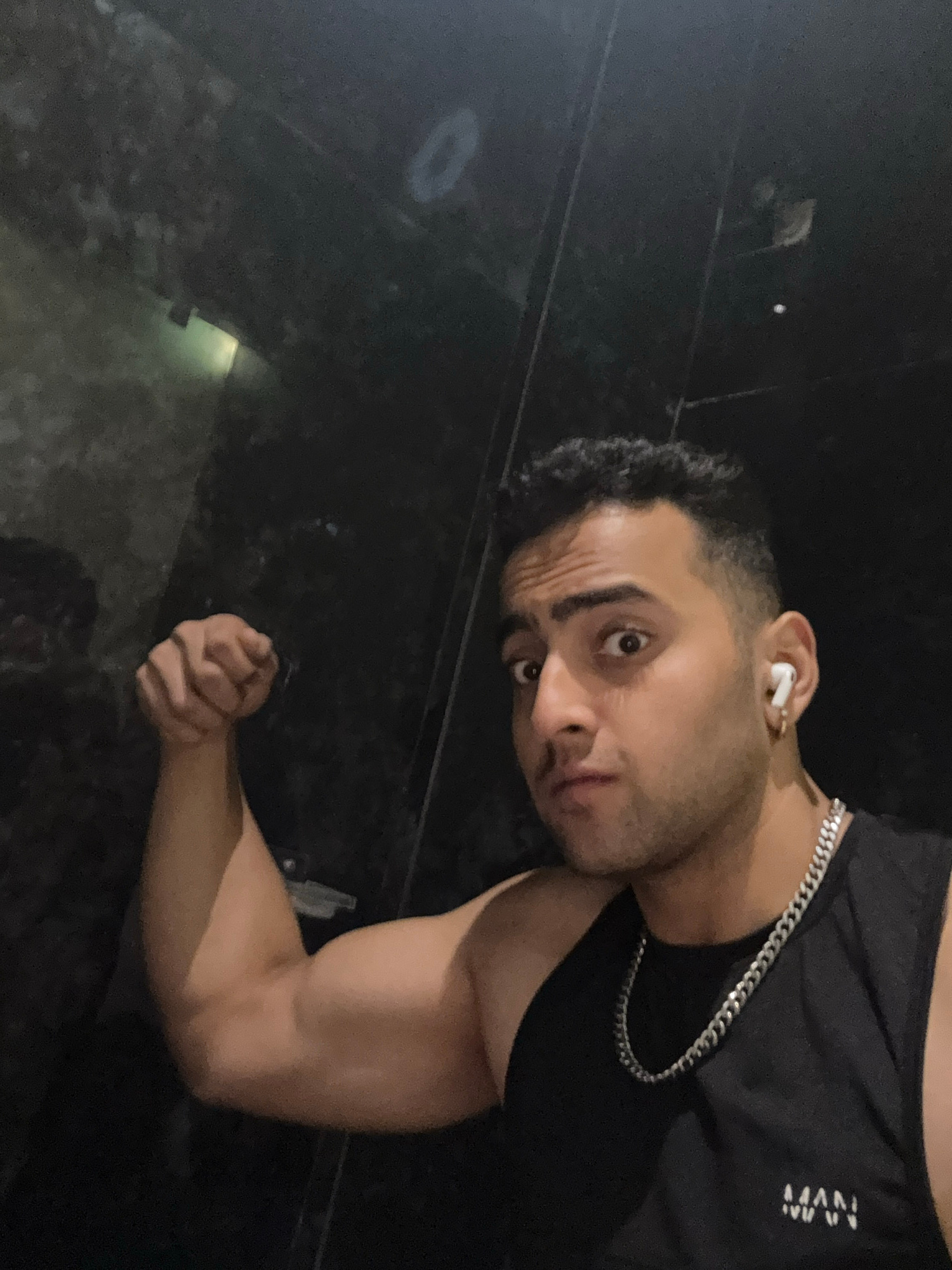 A man wearing a black tank top with the word "MAN" printed on it and a silver chain around his neck is posing for the camera. He is indoors and appears to be in a dimly lit environment, potentially a…read more