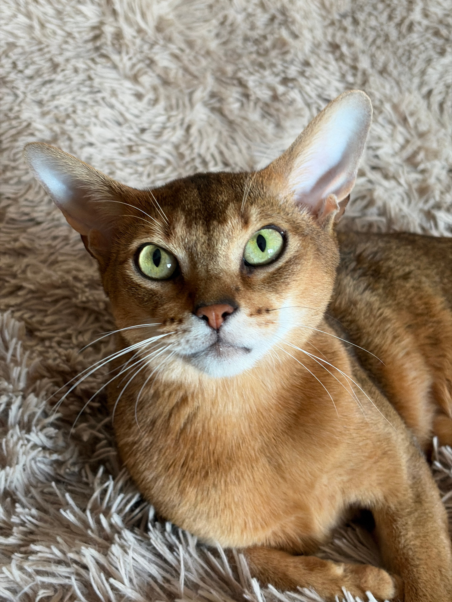 The image displays a close-up, high-angle view of a domestic cat, likely an Abyssinian breed due to its distinctive appearance, lying on a soft, fluffy light beige rug or blanket. The scene is set ind…read more