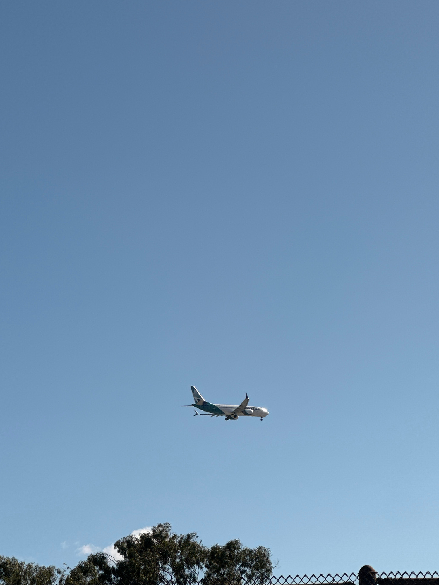 An airplane is flying in the sky. A fence and tree are on the side. The city and state are unknown.