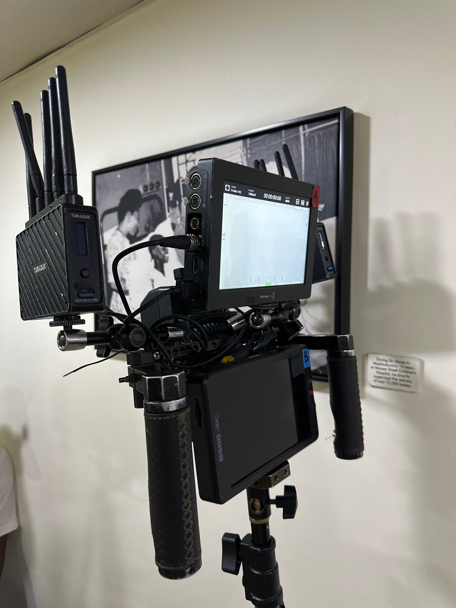 The image shows a video camera rig mounted on what appears to be bicycle handlebars. The rig includes two monitors, one displaying "ProRes HQ" and "1080p24" among other information, and the other disp…read more