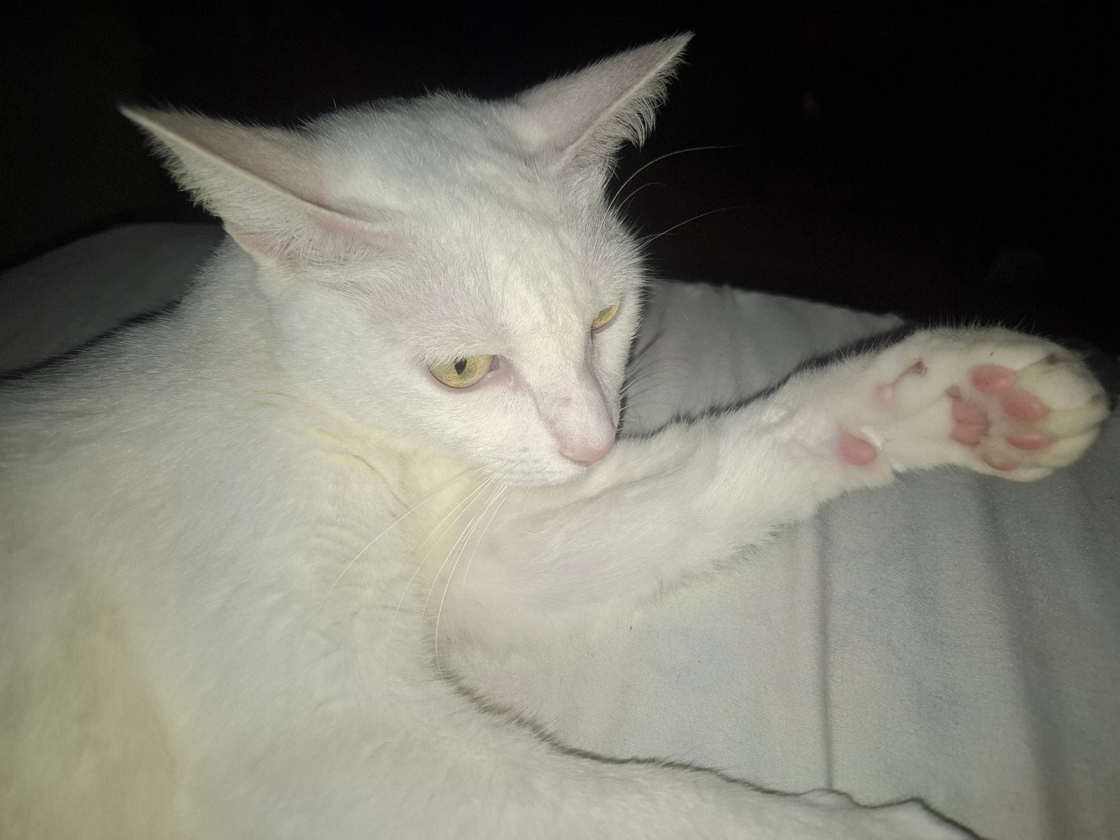 A white cat with yellow eyes is lying on a light-colored surface, possibly a bed or blanket. The cat is facing slightly to the left, with its right paw extended towards the viewer. The pads of its paw…read more
