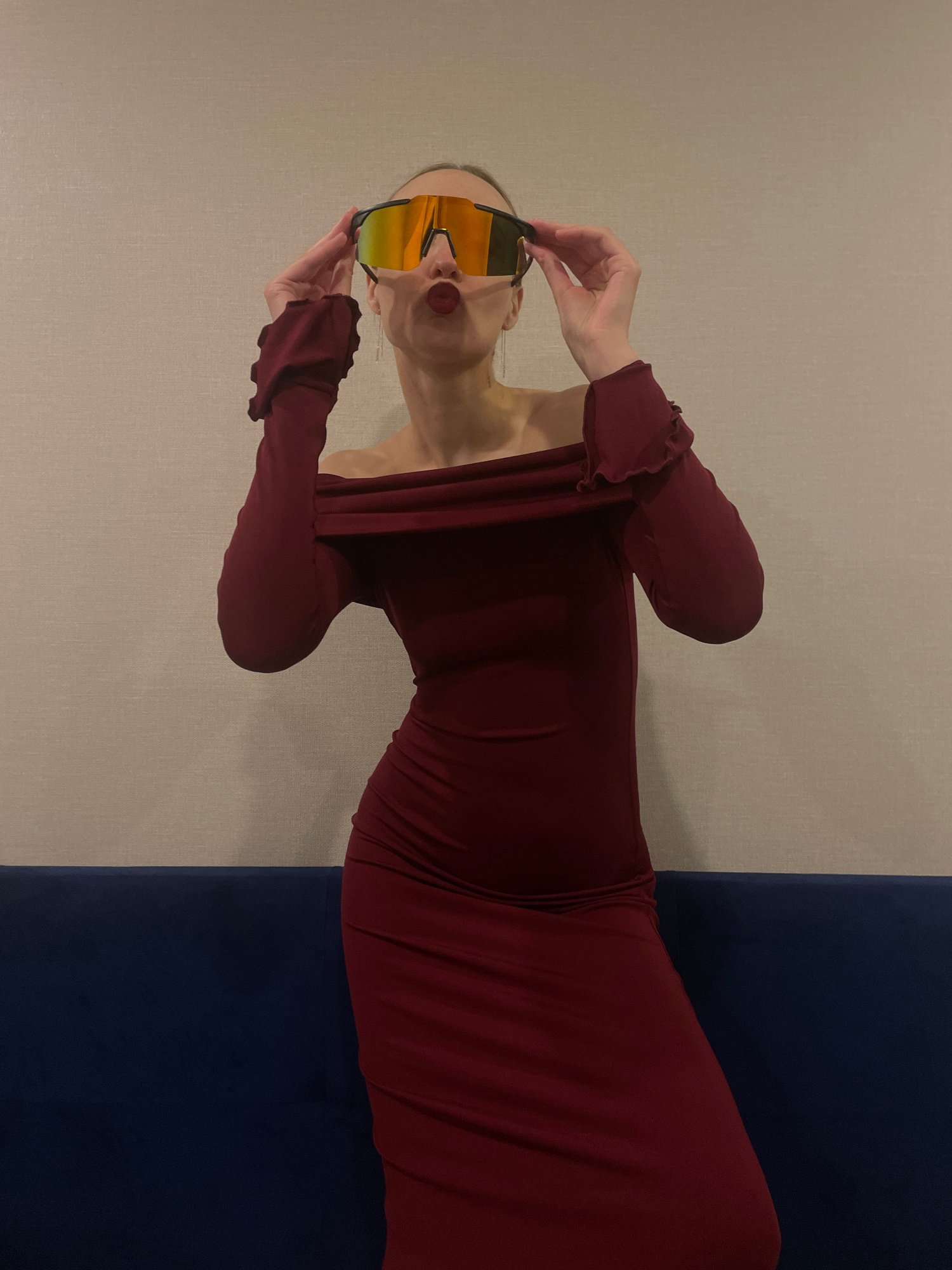 A fair-skinned person with slicked-back hair and long earrings is wearing a dark red, fitted dress with ruffled sleeves and bright yellow sunglasses. The person is holding the sunglasses up to their face. The background consists of a light beige wall on the left and a dark blue surface on the right. The image is rotated counter-clockwise approximately 90 degrees. There is no evidence the image was taken in the city of Подшивалово, Russia. | Open Wire