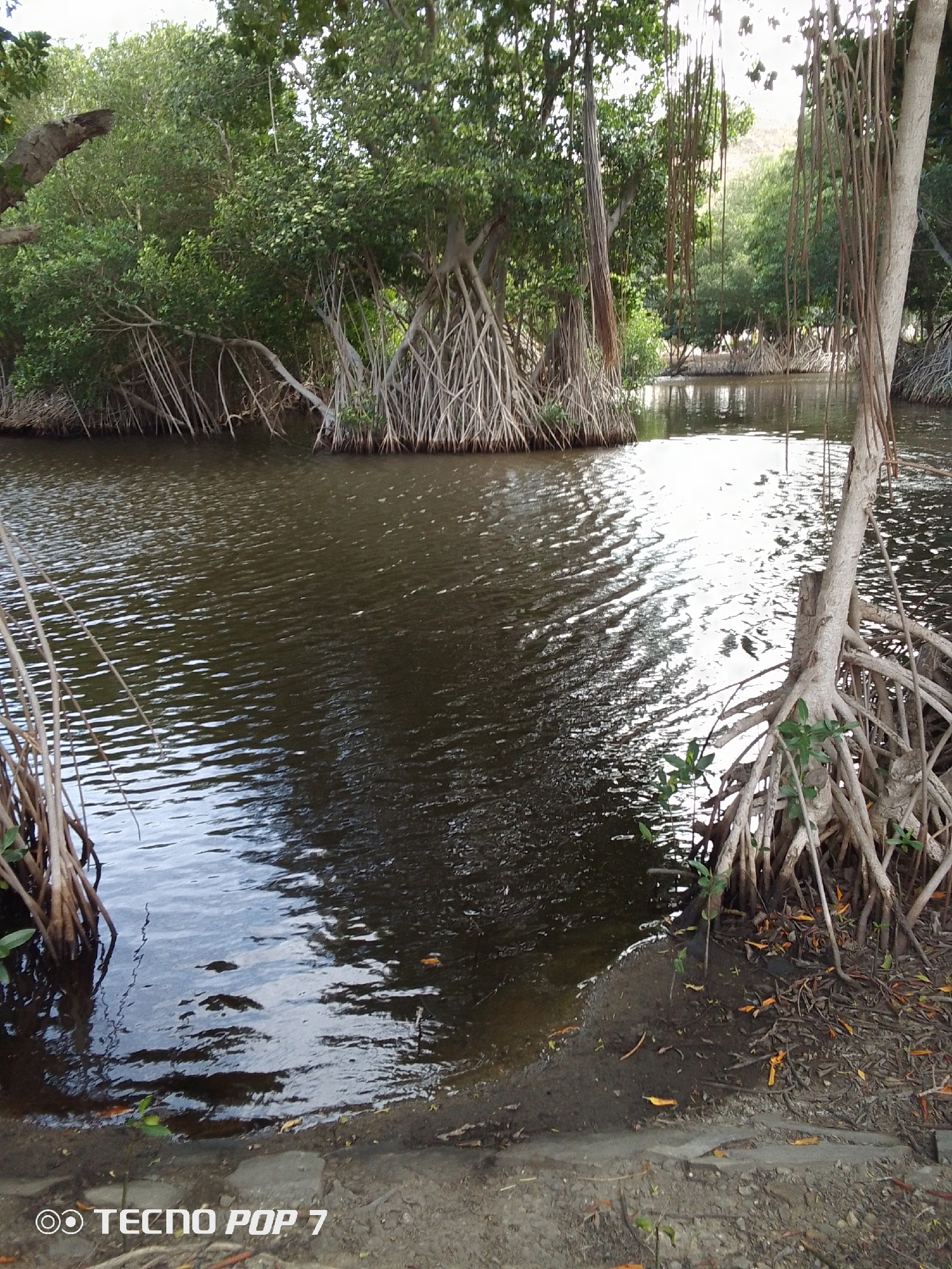 The image depicts a body of water surrounded by mangrove trees. The water is dark, with ripples on the surface reflecting sunlight. The mangrove trees are characterized by their aerial roots, some of…read more