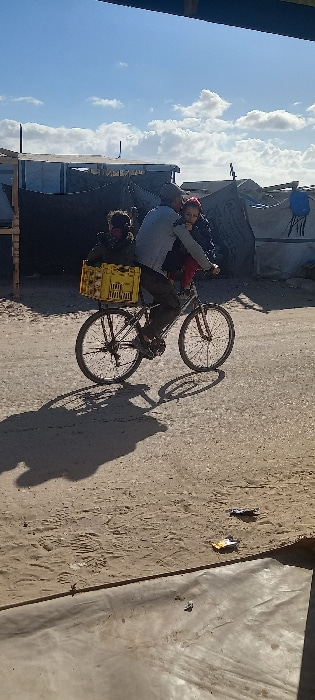 A daytime scene in Khan Yunis, Palestinian Territory, depicts an adult male cycling a bicycle with two children on a dirt and sand path. The adult, wearing a light-colored shirt and dark pants, is pos…read more