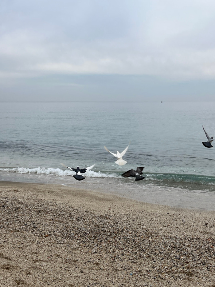 The image displays a coastal scene in Alanya, Turkey, under an overcast sky. The sky is uniformly light grey, meeting a calm, light blue-grey sea at a distinct horizon line. Small, white-capped waves…read more