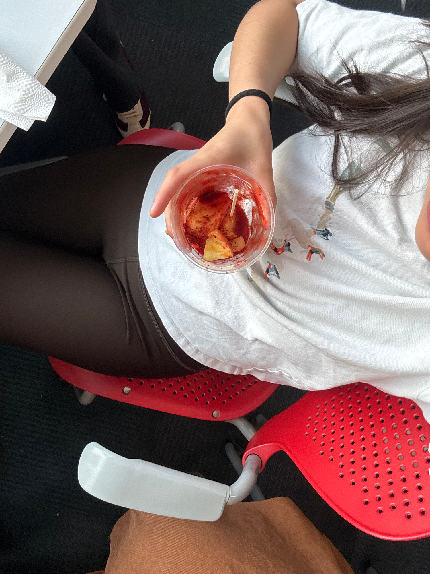 A top-down view depicts a person seated on a red chair. The person, whose head is out of frame, is wearing a white t-shirt with a design of skiers, and dark-colored leggings. In their hand, they hold…read more