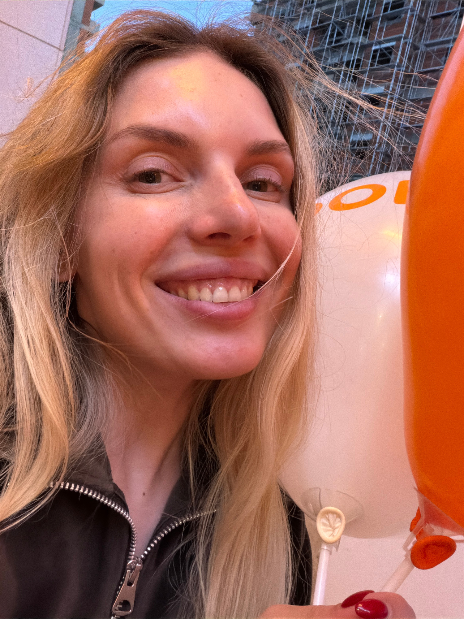A young woman smiles at the camera while holding balloons, in what appears to be an urban setting. The balloons are orange and white. The woman has blonde hair and wears a dark-colored jacket with a v…read more