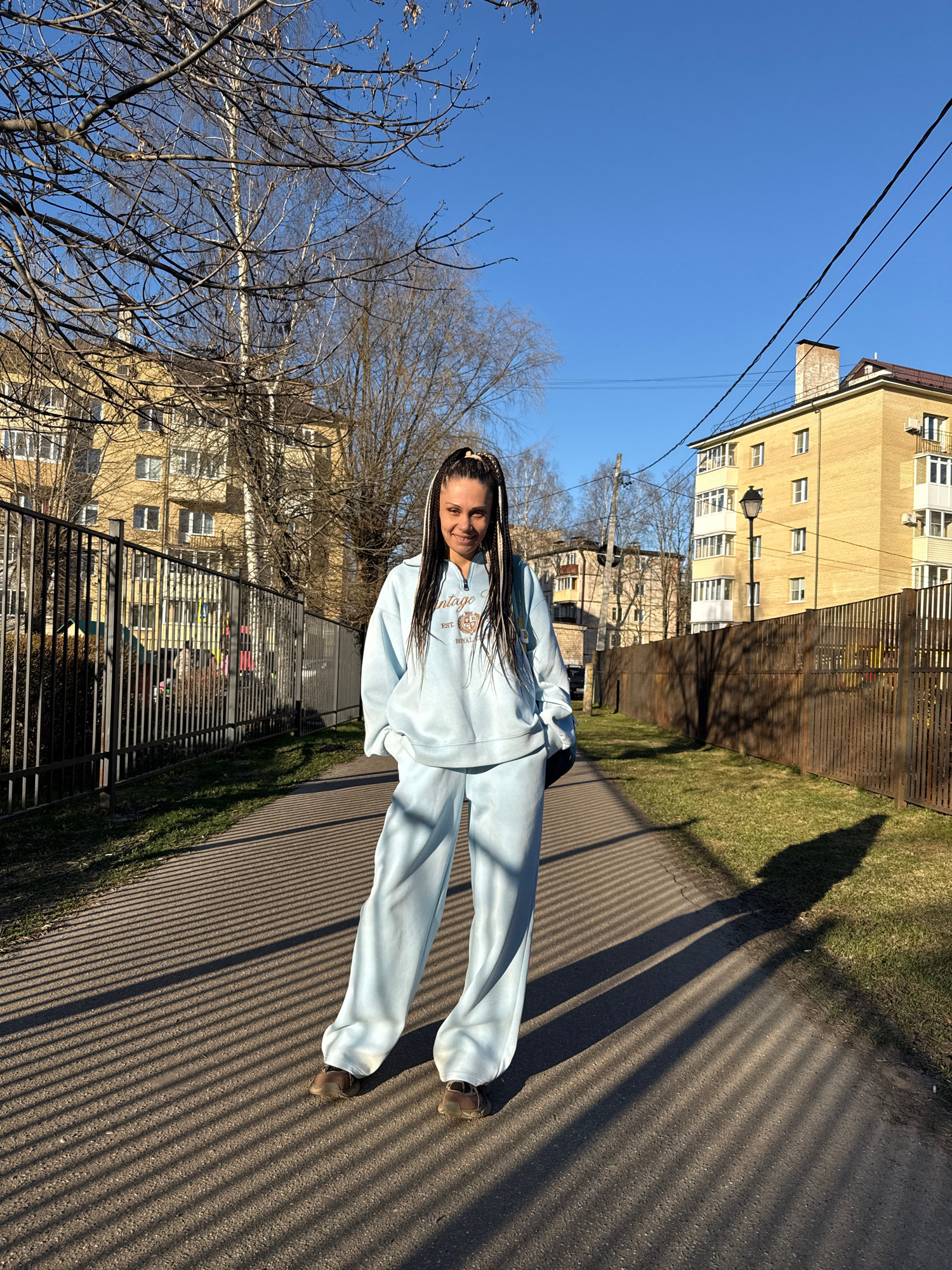 A young woman with long, braided hair stands on a paved path in a residential area of Rusanovo, Russia, on a clear, sunny day. She is wearing a light blue tracksuit, featuring a sweatshirt with the teβ¦read more