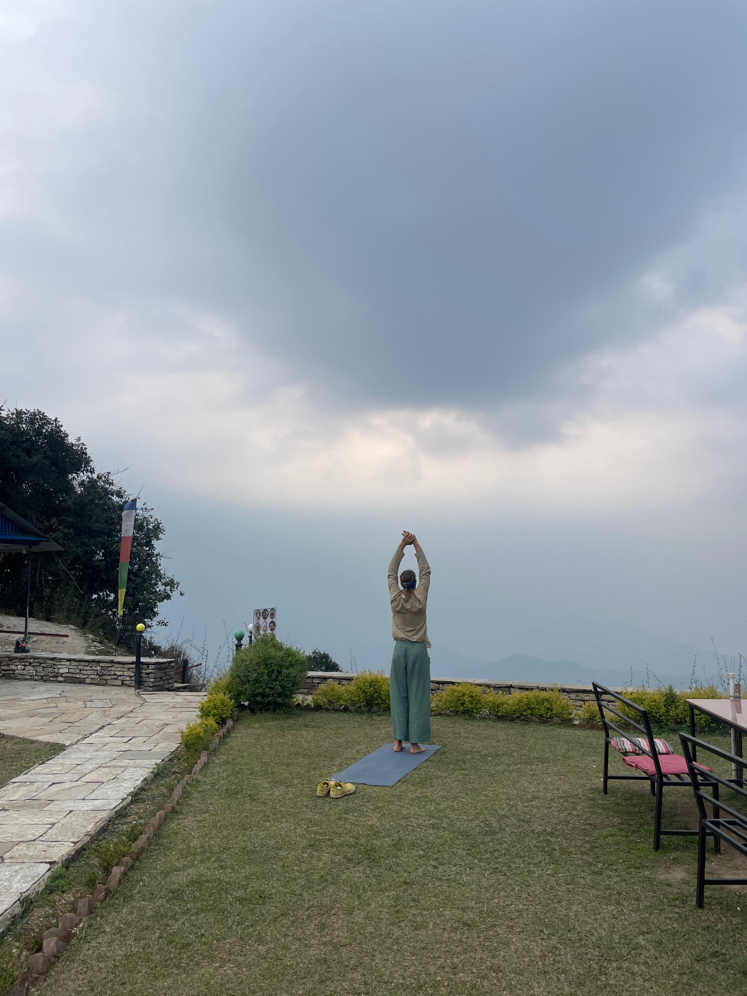 A medium shot presents a figure in a standing position on a grey yoga mat amidst a grassy expanse, likely in Dhampus Phedi, Nepal, judging by the backdrop of mountains and sky typical of the region. T…read more
