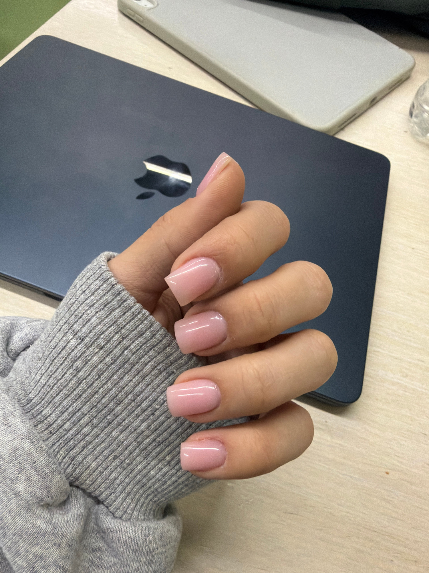 A human hand, adorned with short, square-shaped fingernails coated in a semi-opaque pink polish, rests on a dark blue Apple iPad. The hand is partially covered by the cuff of a grey knit sweater. The…read more