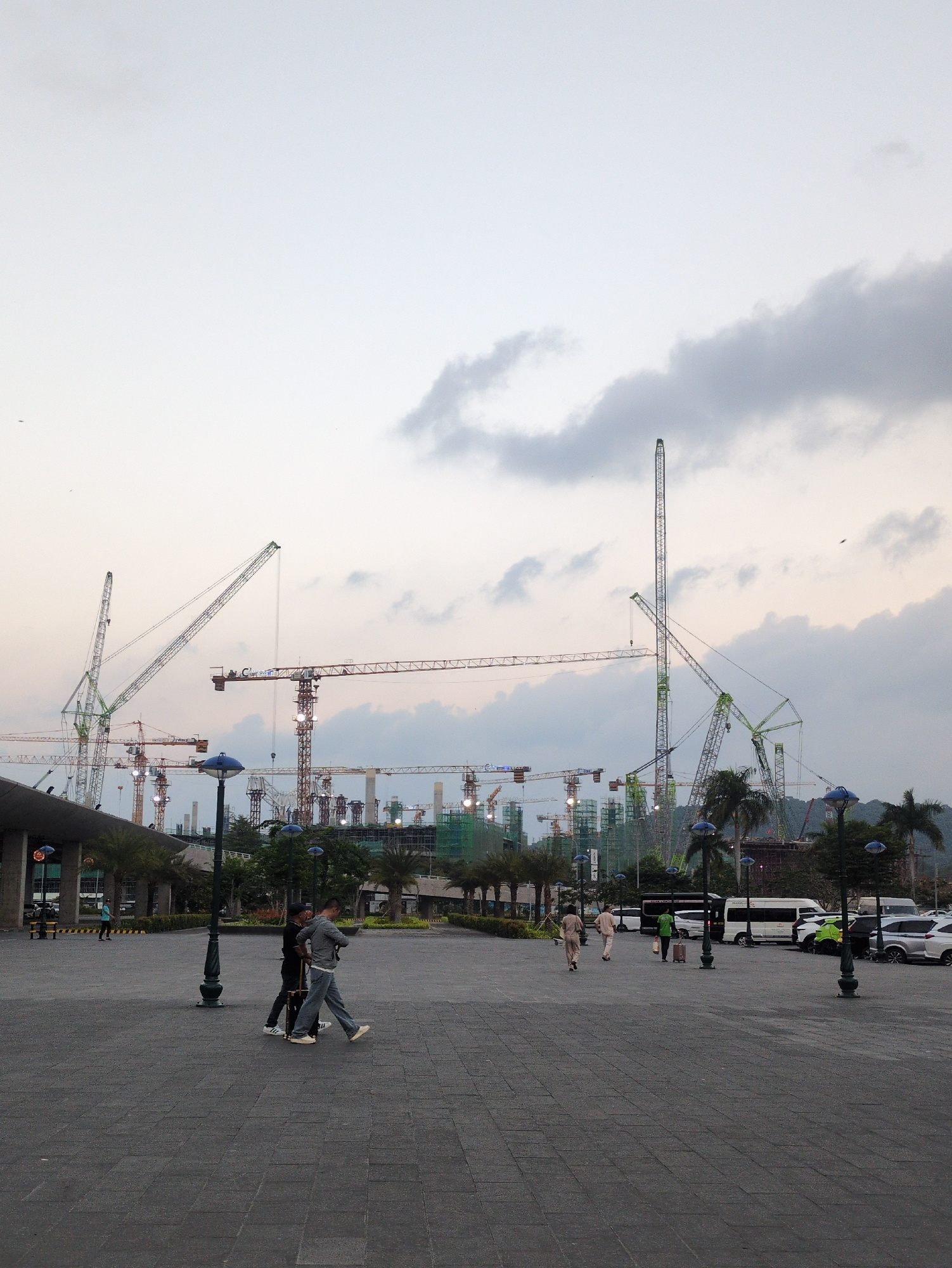 The scene is in Phú Quốc, Vietnam. The environment is an urban area featuring numerous construction cranes against a cloudy sky. In the foreground, there is a paved area with street lamps. Several peo…read more