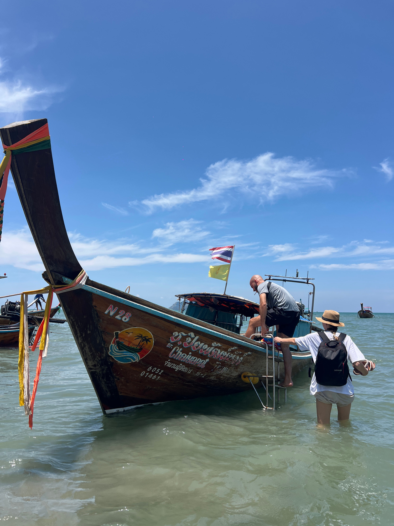 Captured from a low-angle perspective, the image showcases a brightly decorated Thai boat in the shallow, clear waters of Ban Ao Nang, Thailand. Two individuals are seen on the boat. One is standing o…read more