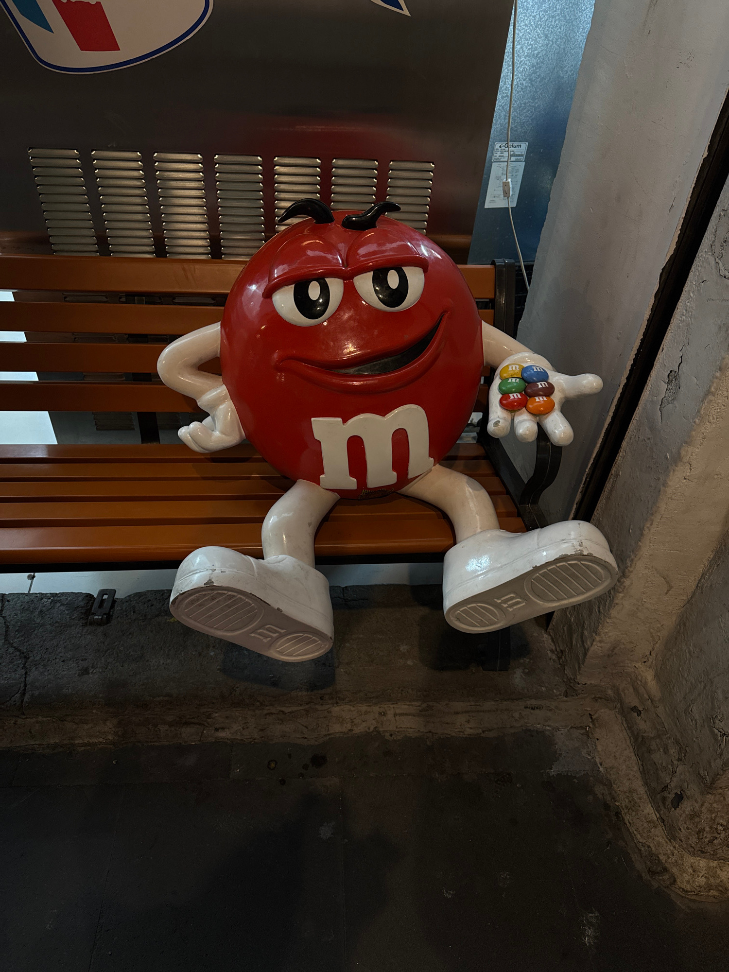 The image shows a red M&M character statue sitting on a wooden bench. The statue holds several M&Ms in its hand and wears white sneakers. It is located next to a vending machine with a blue and red lo…read more