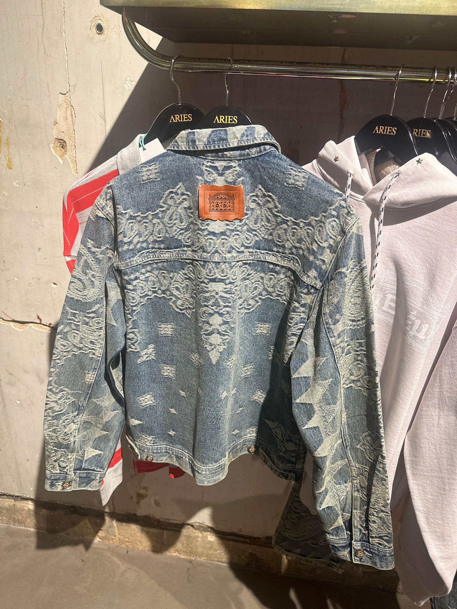 This media file captures an indoor scene, likely within a retail store or a display area, featuring several garments hanging on a rack. The primary subject is a blue denim jacket with an intricate, li…read more