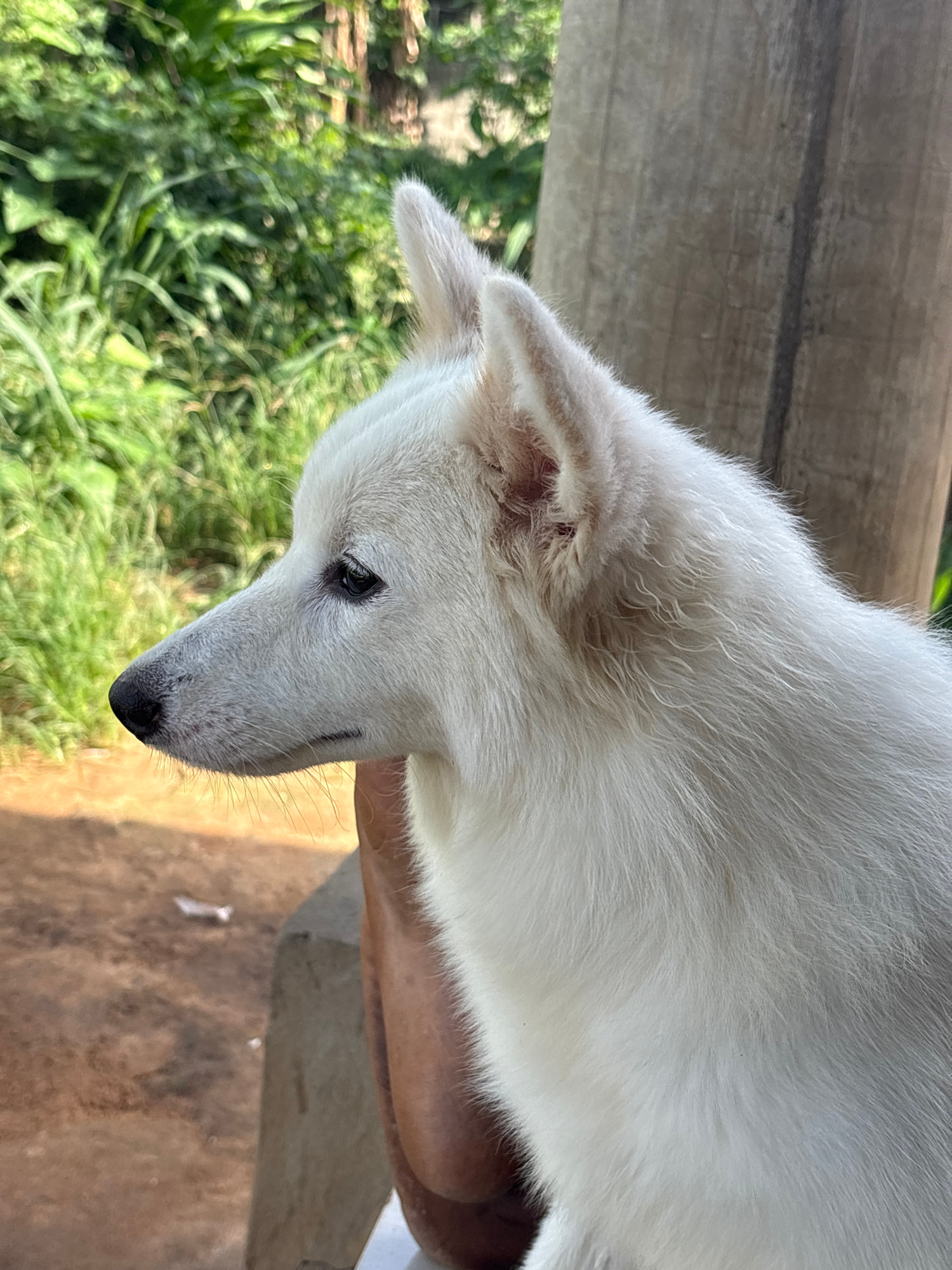 A close-up, tilted shot shows a white dog with short fur. The dog is outside, with greenery visible in the background. A wooden surface is also in the background. There's no evidence to place the imag…read more