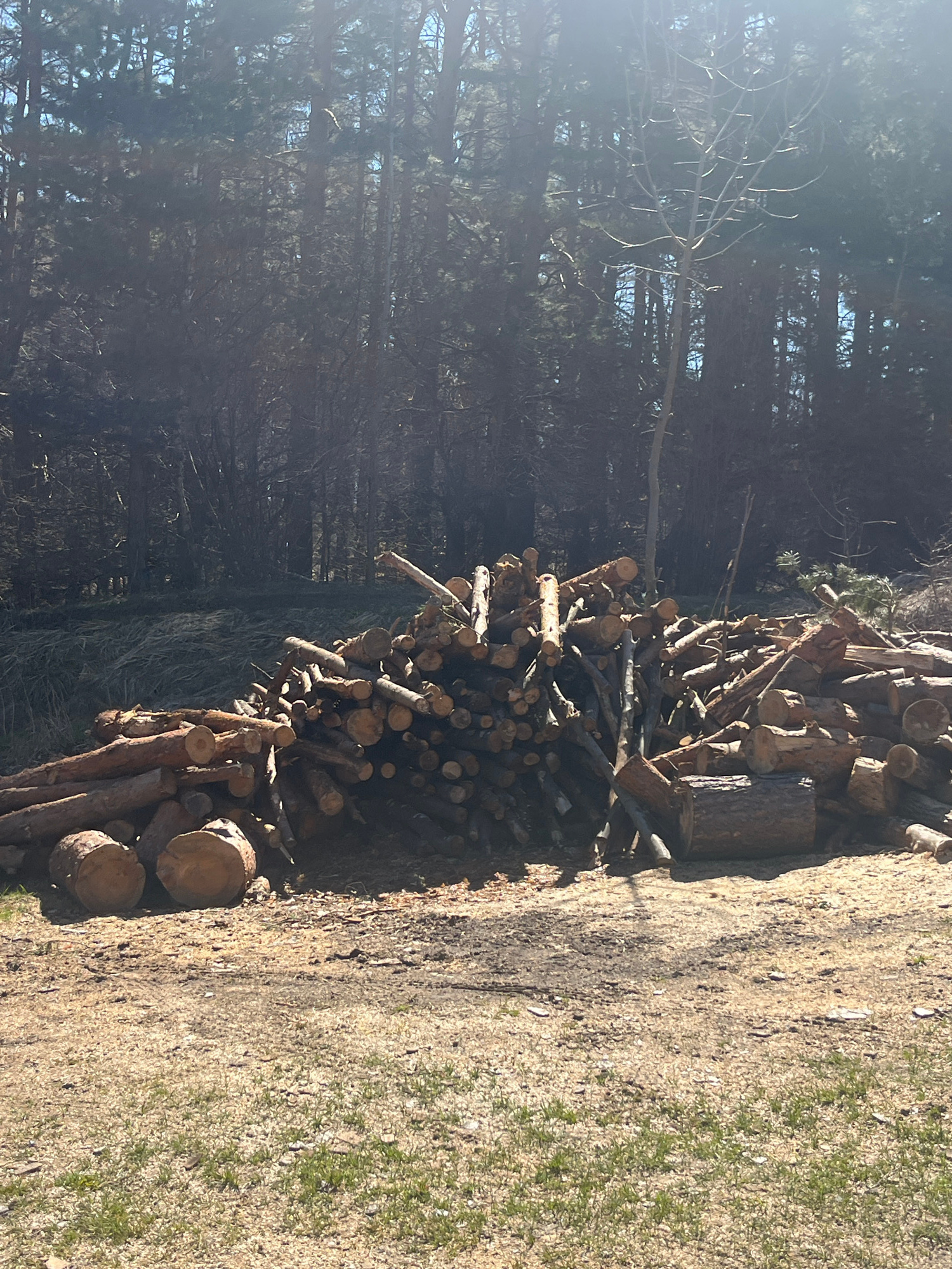 The image depicts a stack of felled logs and branches positioned at the edge of a forest and a grassy area. The forest consists of dense, tall trees. The logs are various sizes, from large to small br…read more