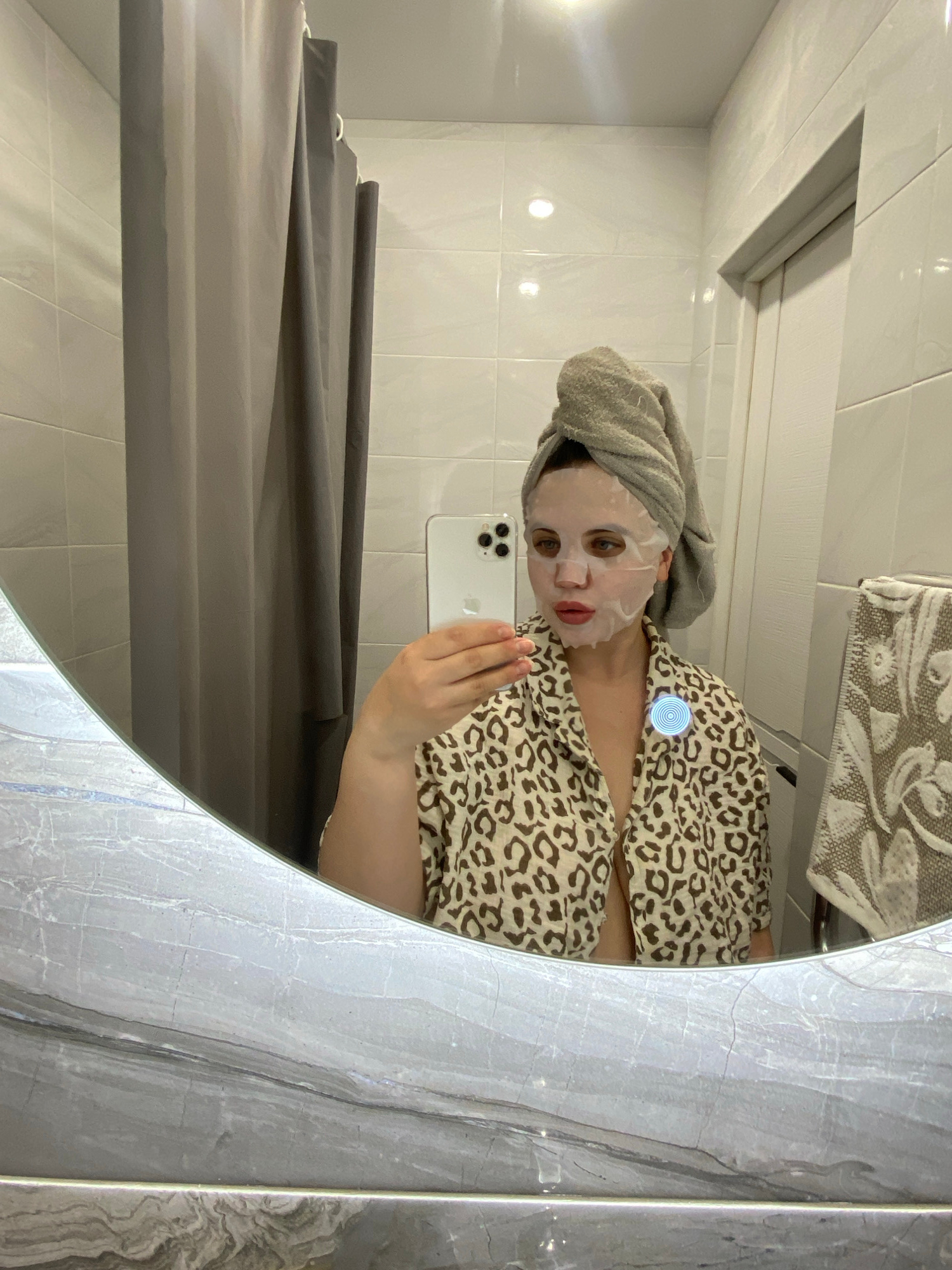 A person is taking a selfie in a bathroom. The reflection in a round mirror reveals a woman wearing a facial mask and a towel on her head, clad in a leopard-print robe. She is holding a smartphone. A…read more