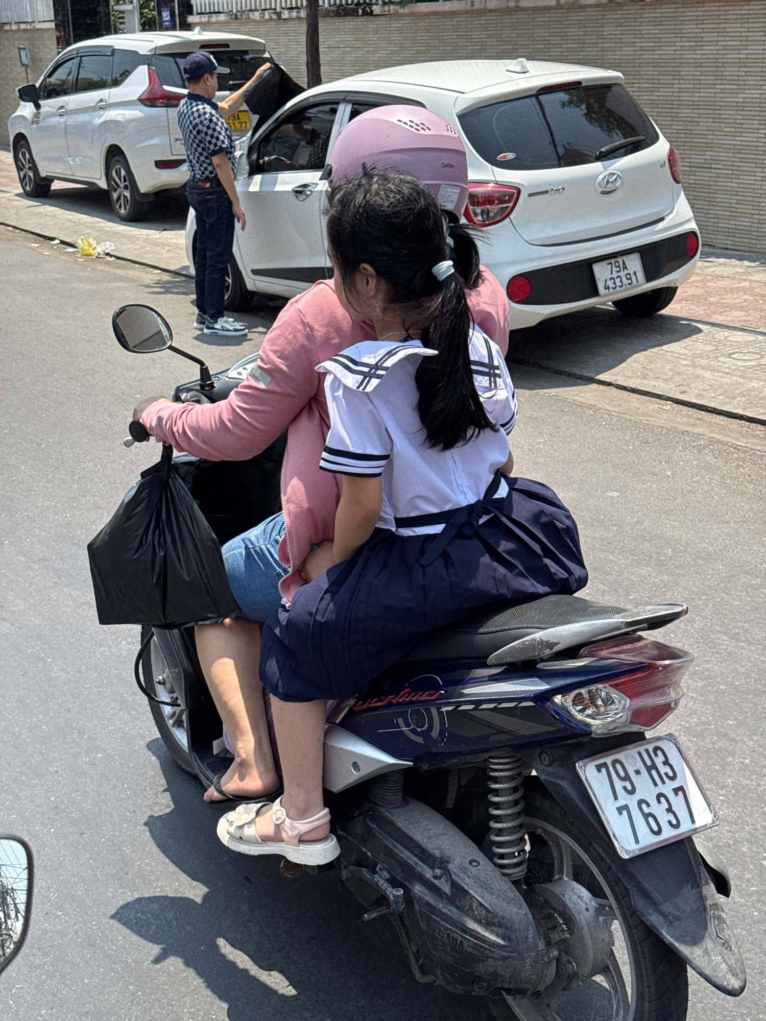 The image captures a scene on a city street. A person wearing a pink helmet and jacket is seated on a motorbike, embracing a younger individual wearing a school uniform with a navy skirt and white top…read more