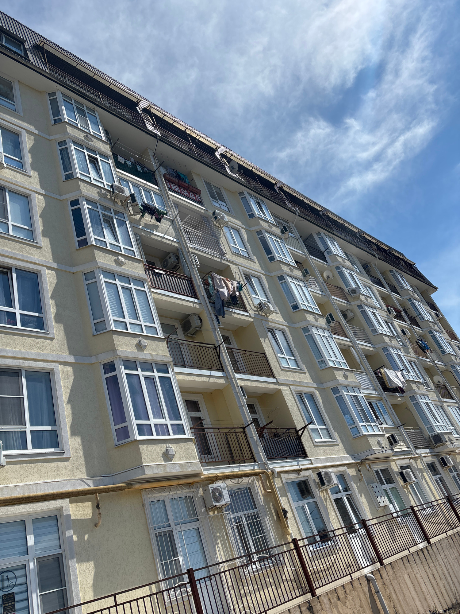 View looking up at the side of a tall apartment building with cream-colored exterior walls. The building has numerous windows, some with white frames, and some are surrounded by air conditioning unitsβ¦read more