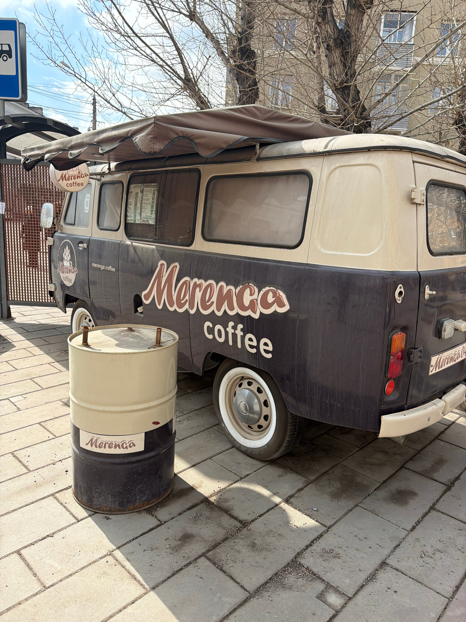 A coffee van called "Merenca coffee" parked on a brick sidewalk. The van is painted cream and dark gray with the words "Merenca coffee" written on the side and a logo. A metal barrel painted to match…read more