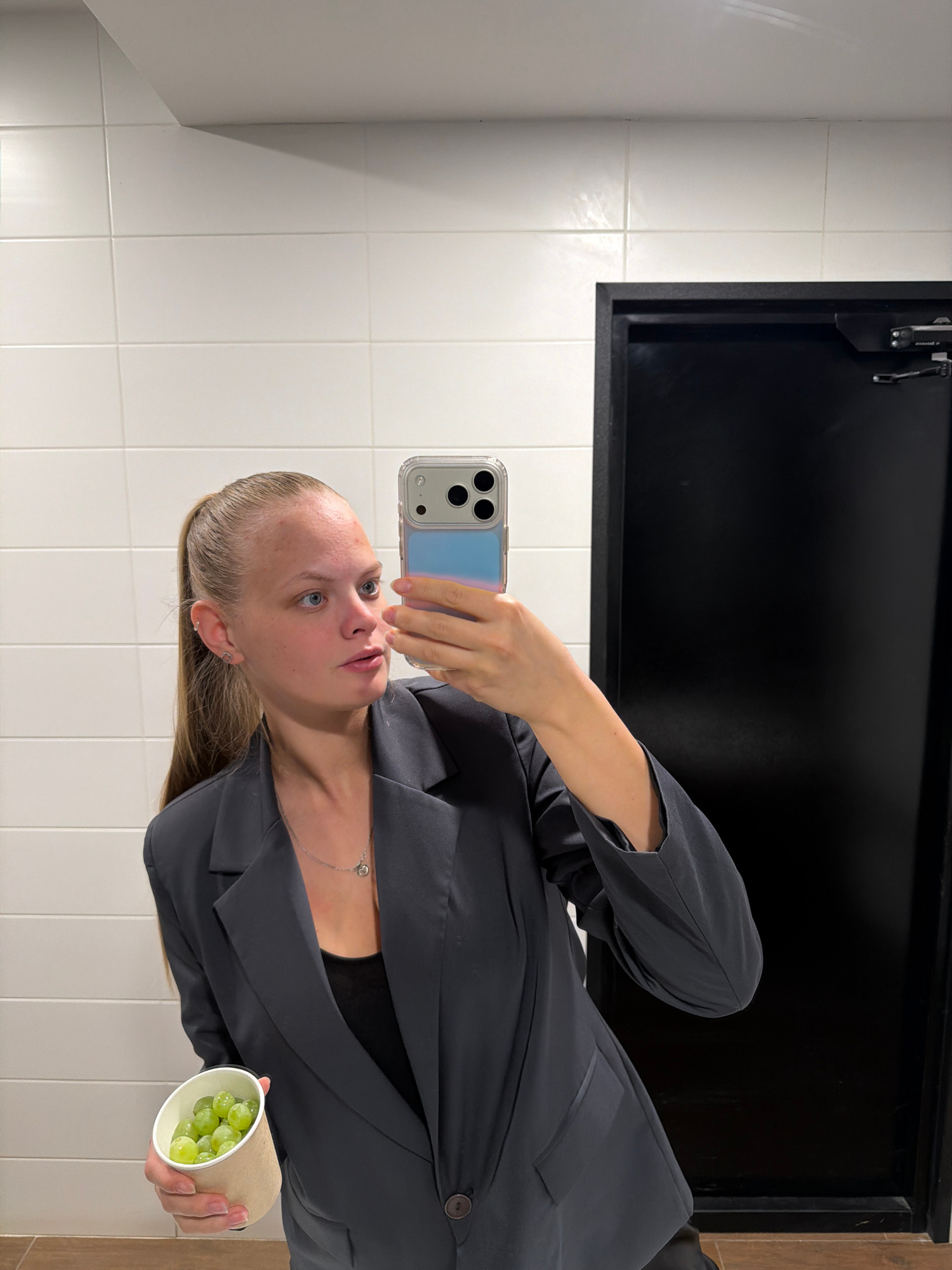 A woman is taking a selfie in what appears to be a bathroom. The background consists of white tiled walls and a black rectangular element resembling a mirror or panel with a metallic hinge. The woman…read more
