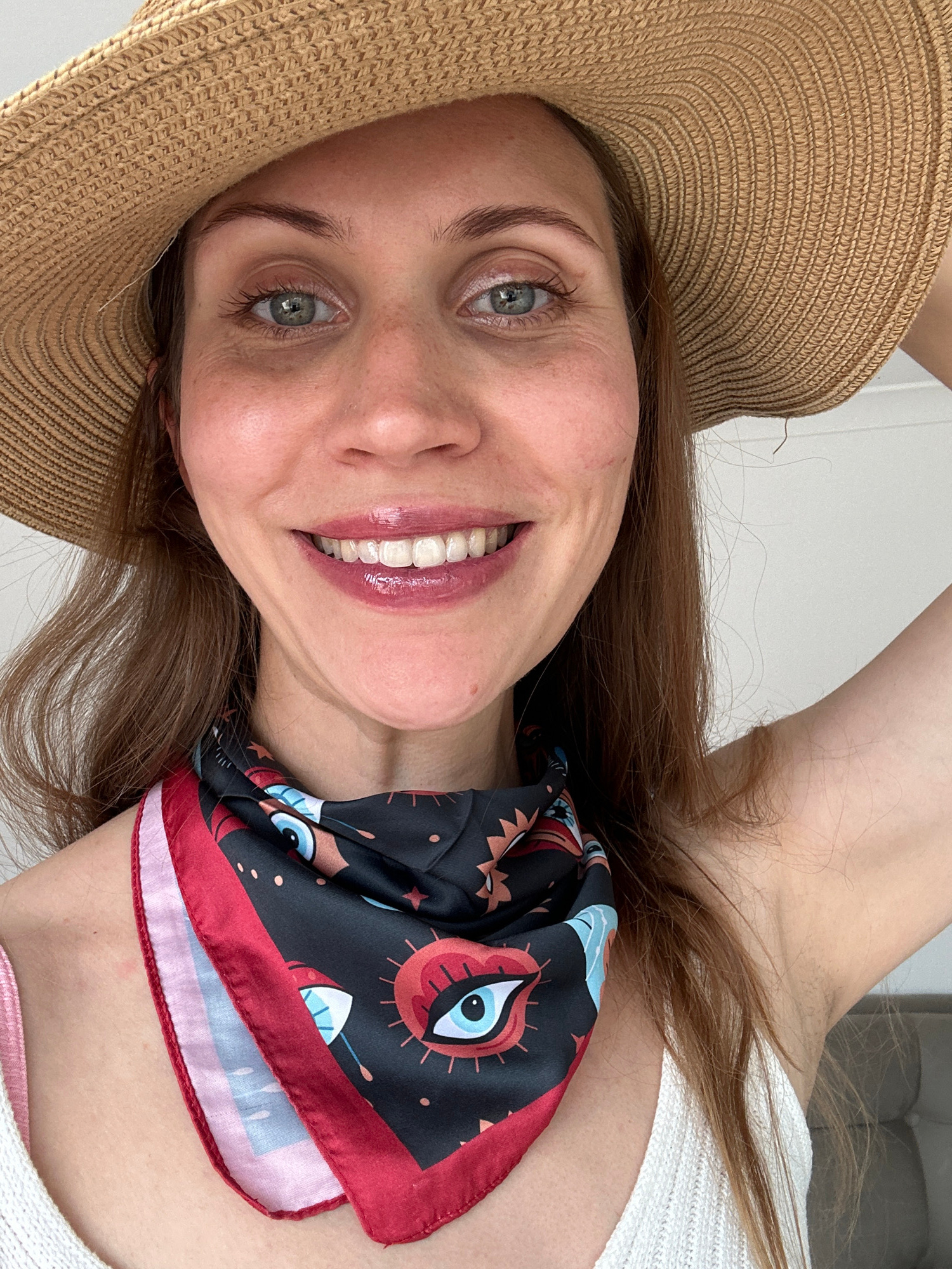 A young woman, facing the camera at an angle, is smiling broadly with visible teeth. She is wearing a tan woven sun hat and a black silk scarf with a red border, decorated with eye-like designs, aroun…read more
