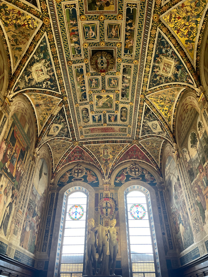 The image displays the interior of the Piccolomini Library, located within the Siena Cathedral (Duomo di Siena) in Siena, Italy. The scene presents a grand hall characterized by an elaborately decorat…read more