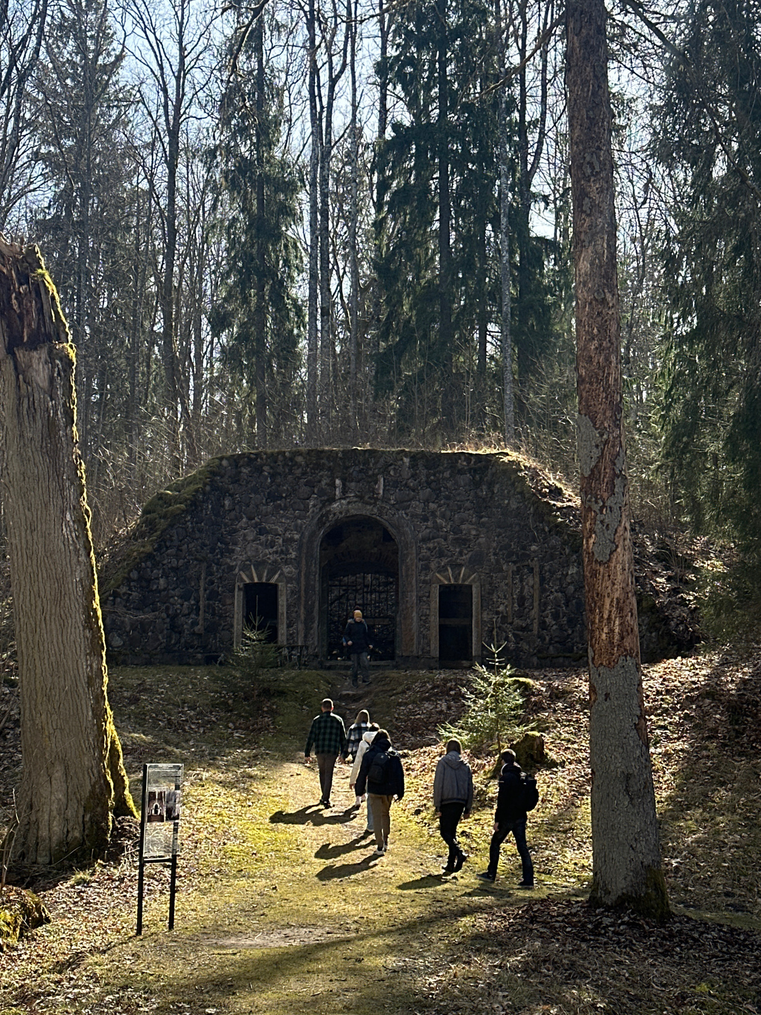 The image shows a stone building in a wooded area near Bīriņi, Latvia. The building has an arched entryway with a barred gate and two windows on either side of the entrance. The structure appears to be moss-covered and constructed from rough-hewn stones. A group of people are walking on a path adjacent to the building, and their shadows are visible on the ground. One person is standing near the entrance. The surroundings consist of trees and ground covered with grass, moss, and fallen leaves. A sign or display stand is placed on the edge of the path. The time of day is likely daytime, with sun shining through the trees, creating shadows and highlights. | Open Wire