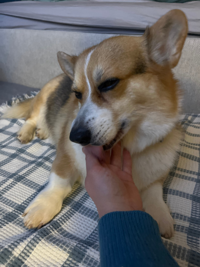 A corgi with cream and tan fur lies on a plaid blanket. A hand gently pets the dog’s chin and throat. The corgi's eyes are closed, and its black nose points slightly downward. The plaid blanket has a…read more