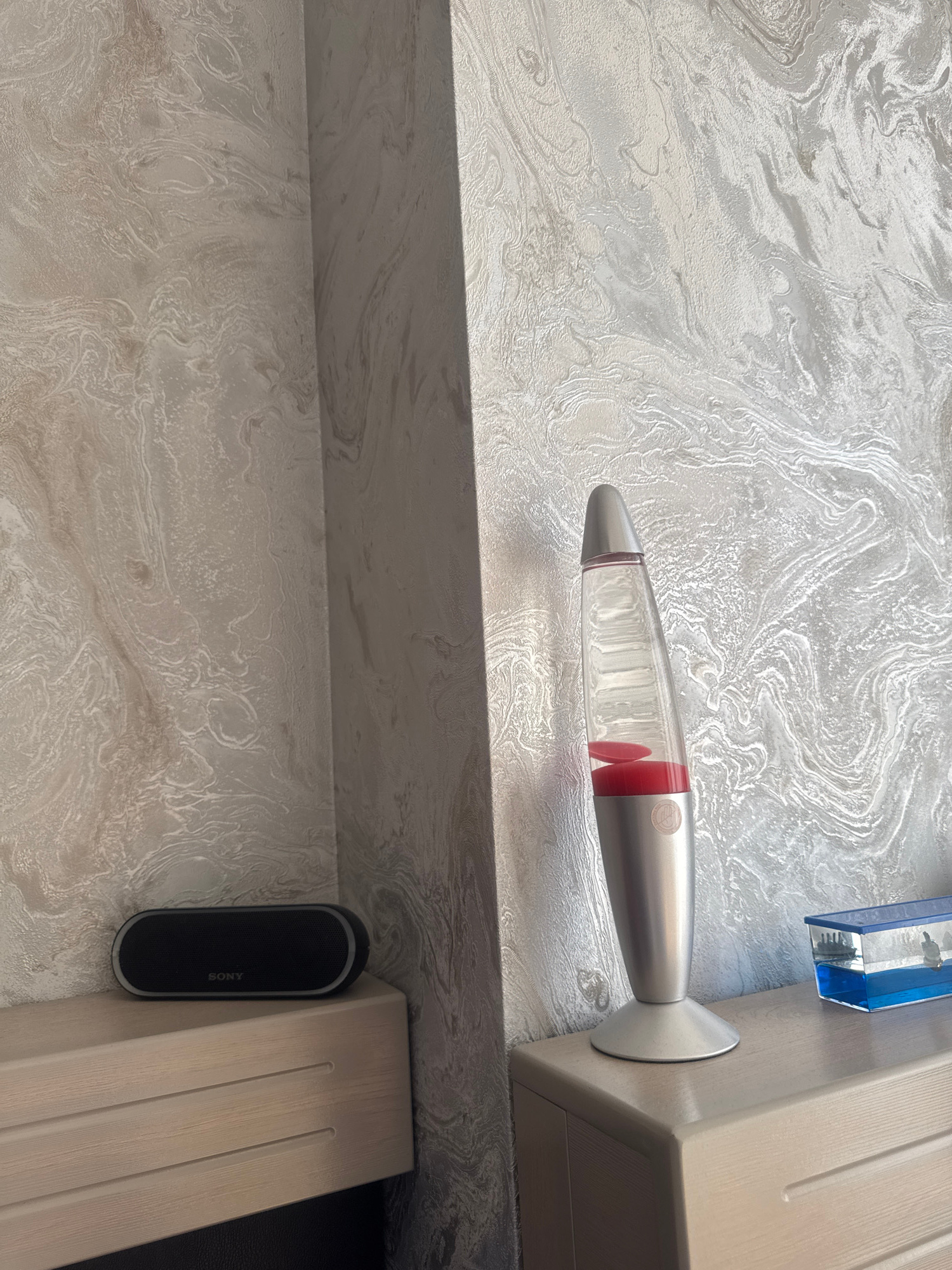 A close-up indoor shot from Tbilisi, Georgia displays a section of a wall with a patterned, light-grey marble-effect wallpaper. A floating shelf with the same wallpaper design is visible in the lower…read more