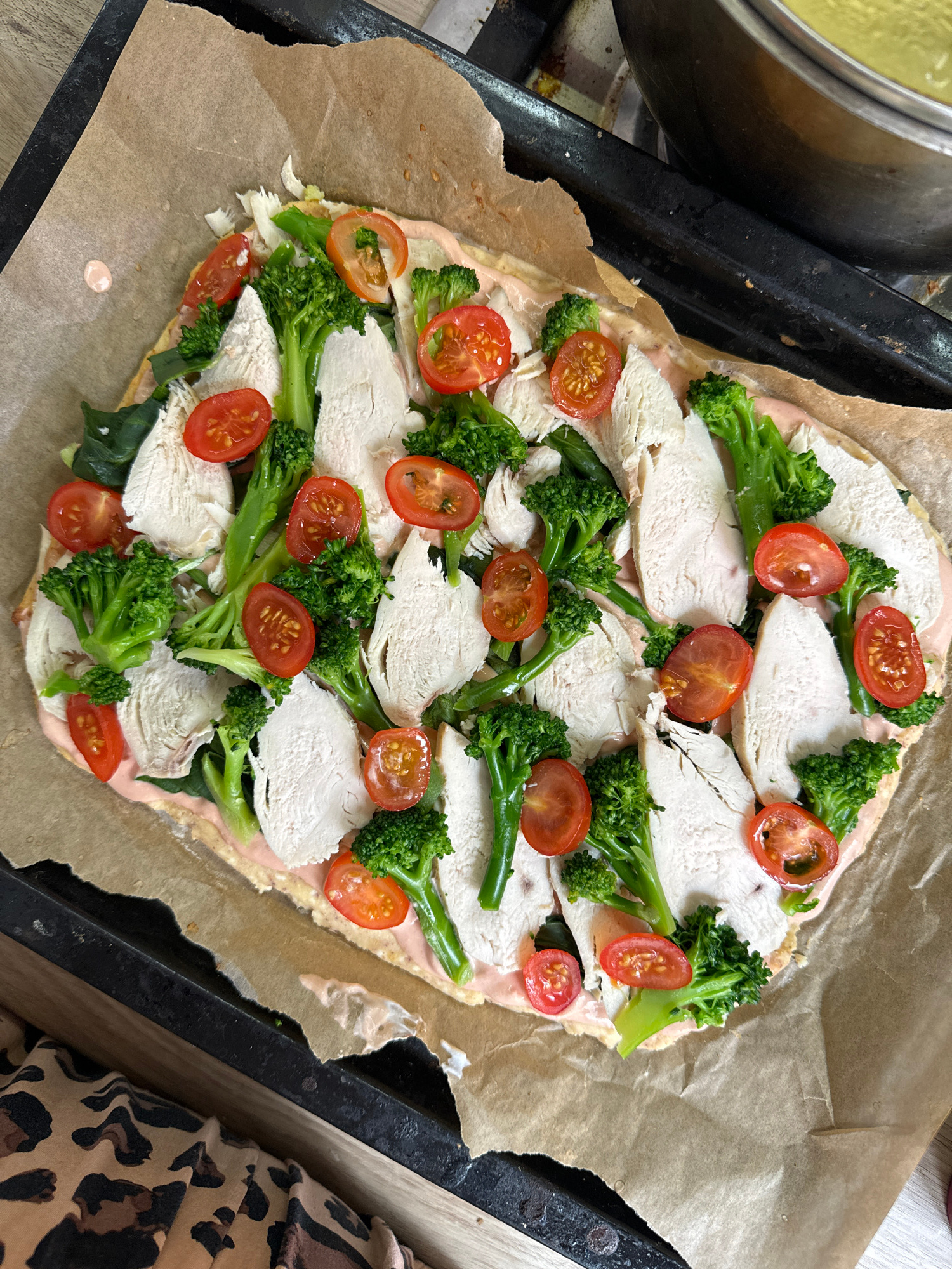 A rectangular flatbread pizza, placed on baking parchment on a dark baking sheet, features a light pink sauce base, covered with layers of sliced white meat, broccoli florets, and halved cherry tomatoβ¦read more