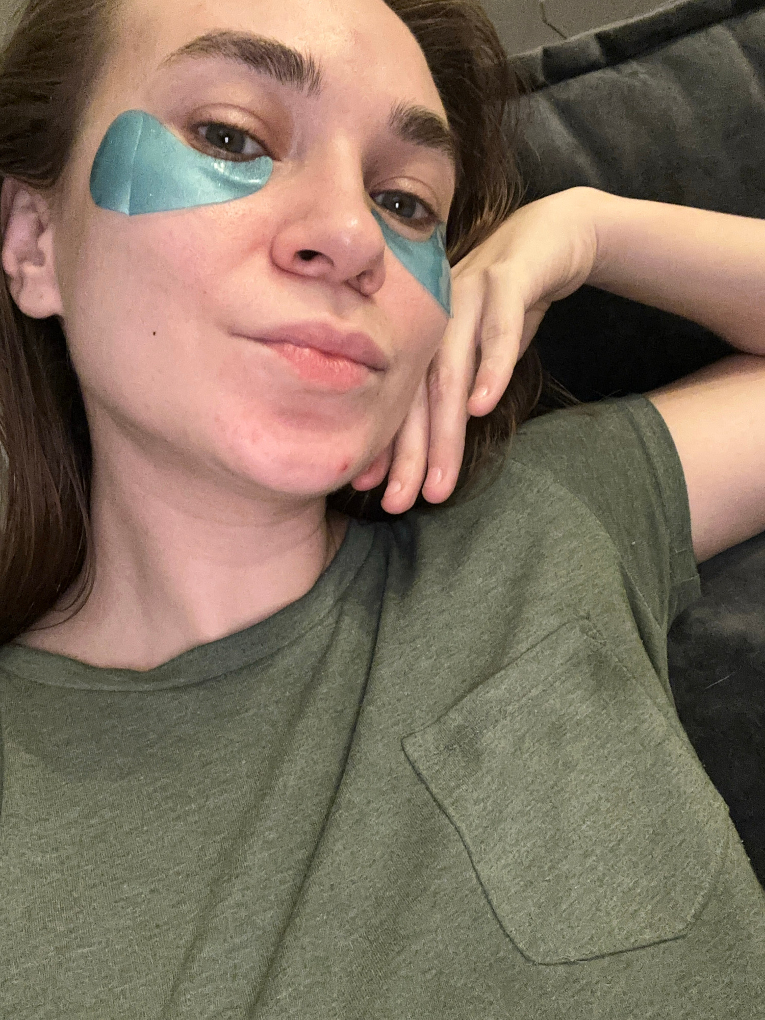 A woman is lying on a gray couch wearing an olive green t-shirt. She has eye masks on. The location is unknown, and no evidence indicates the city of Kharnavy, Russia.