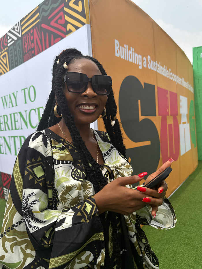 A female subject is depicted outdoors in Itirin, Nigeria, positioned slightly right of the frame's center, facing the viewer and smiling. She has dark skin, wears large square black sunglasses, golden…read more