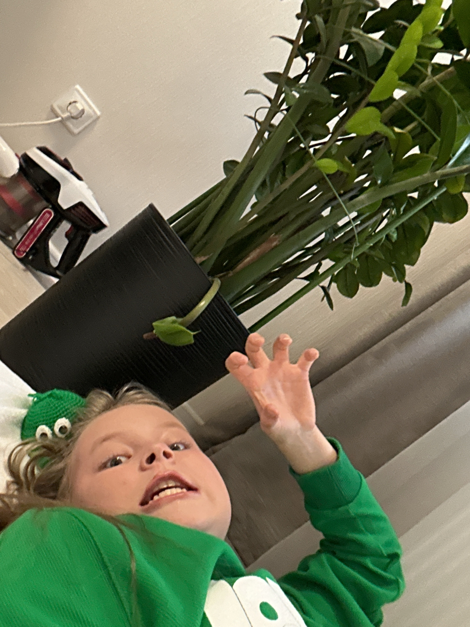 A young child in a green outfit lies on their side next to a large green plant in a black pot. The child is looking at the camera with a smile, and their hand is reaching out towards the plant. An ele…read more