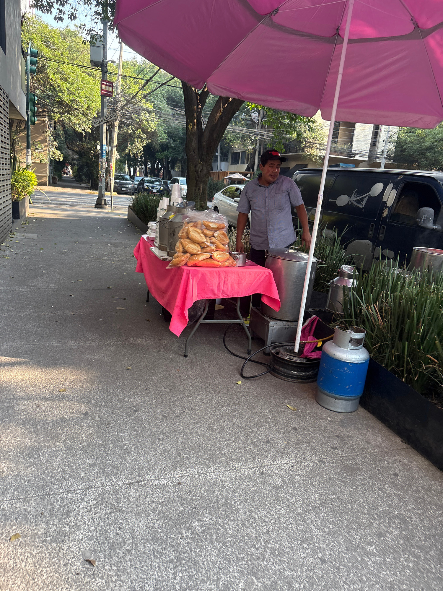 The image shows a street vendor in Mexico City, Mexico, positioned on a paved sidewalk alongside a road lined with trees and parked cars. The vendor, a man wearing a light-colored shirt, stands behind…read more