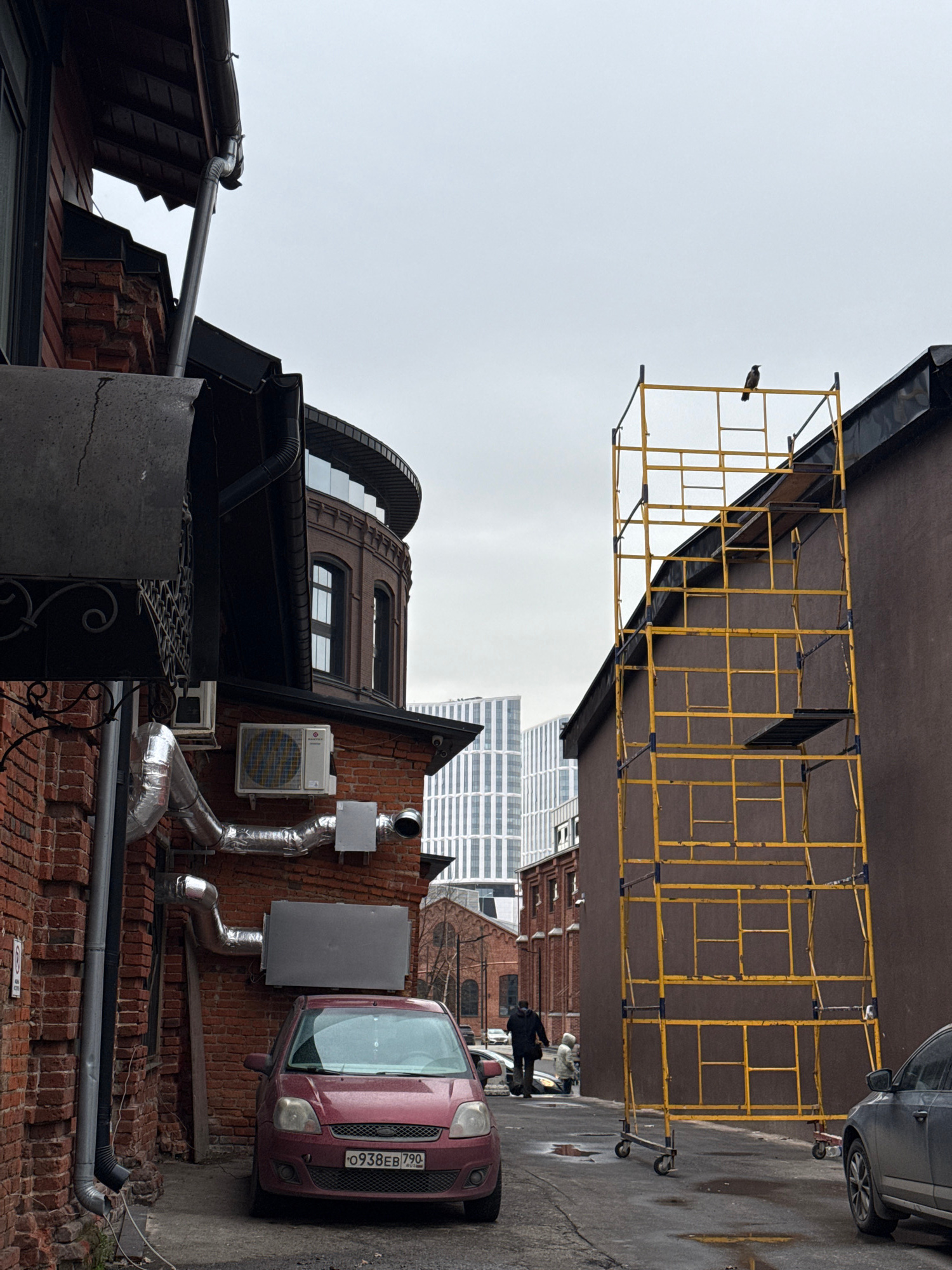An outdoor urban scene in Moscow, Russia, captures a narrow alleyway or street on an overcast day. The image features a mix of architectural styles, with older brick buildings alongside modern high-ri…read more