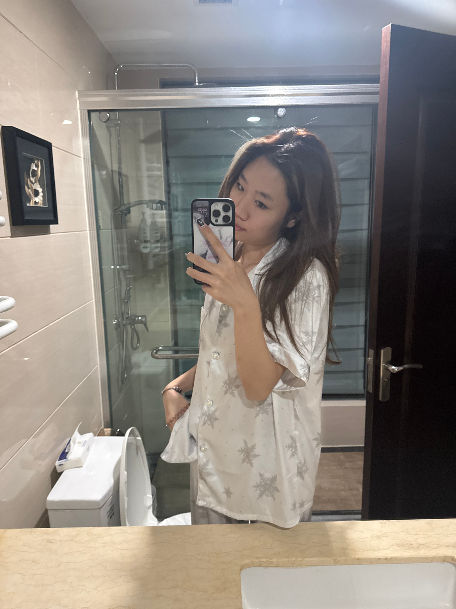 A young Asian woman is taking a selfie in a bathroom mirror. She has long brown hair and is wearing a white pajama top with a snowflake pattern. She is holding a smartphone with a white case in her leβ¦read more