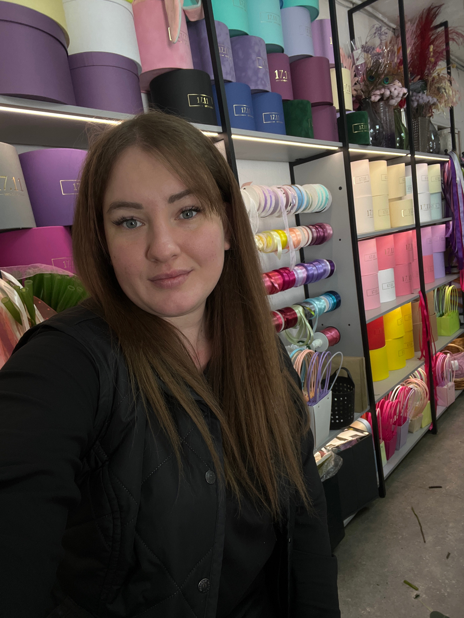 The image depicts a woman taking a selfie in what appears to be a florist shop. The shelves behind her are filled with various floral supplies, including round boxes in a range of colors, rolls of rib…read more