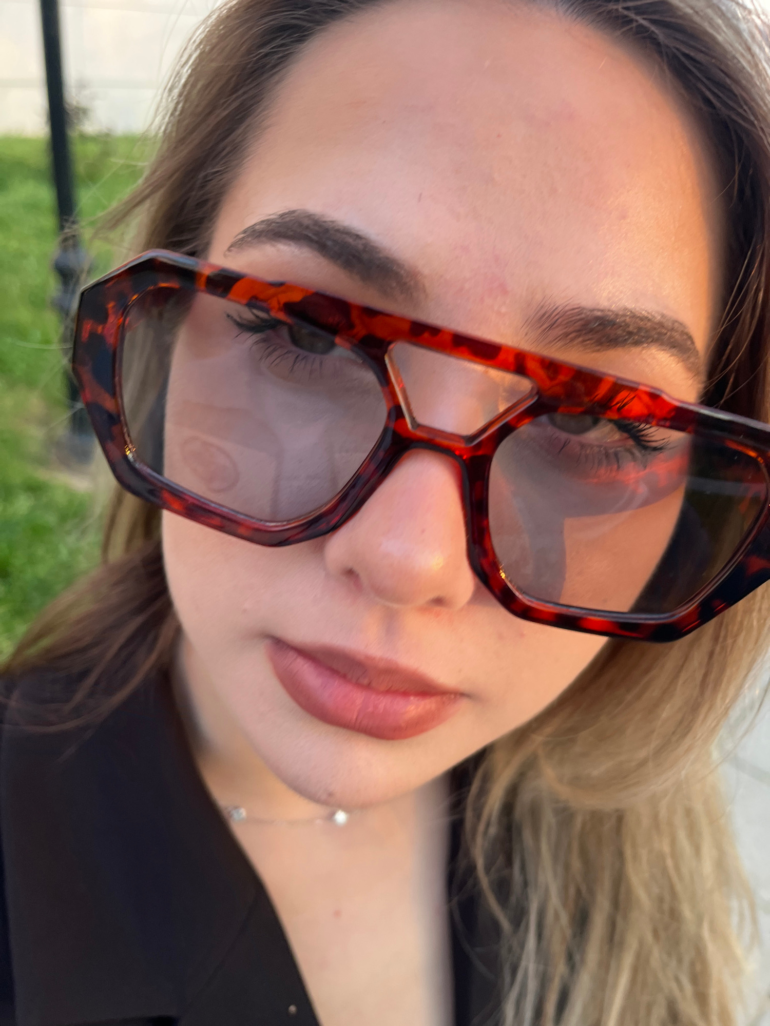 This close-up, angled portrait features a person captured from the shoulders up, set against an outdoor background in Blagoevgrad, Bulgaria. The subject, likely female, wears large, stylish tortoisesh…read more