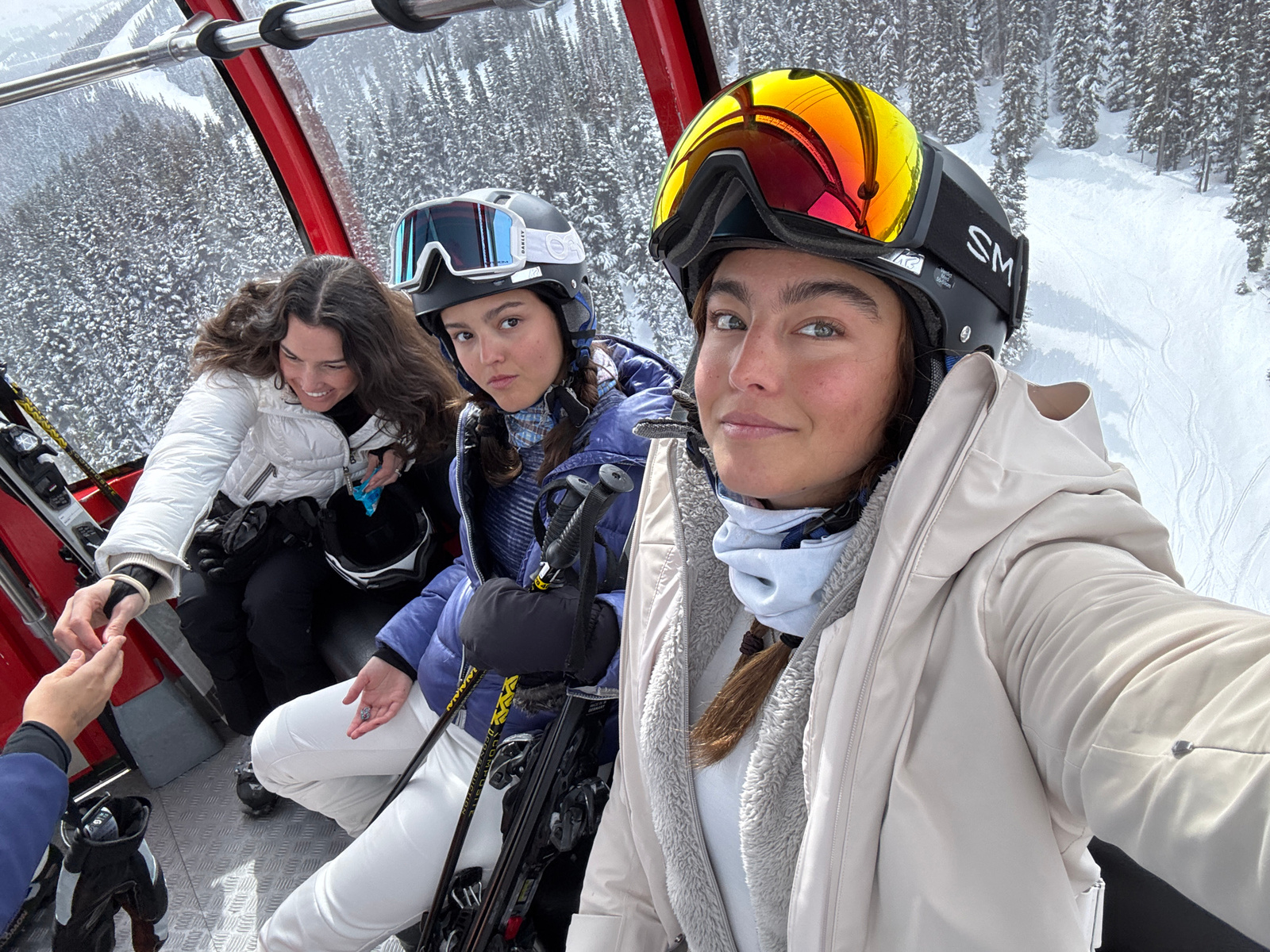 Three women are riding inside a red Whistler-Blackcomb gondola in Whistler, Canada. The woman in the foreground is taking a selfie. She is wearing a cream-colored jacket, a light blue neck warmer, and…read more