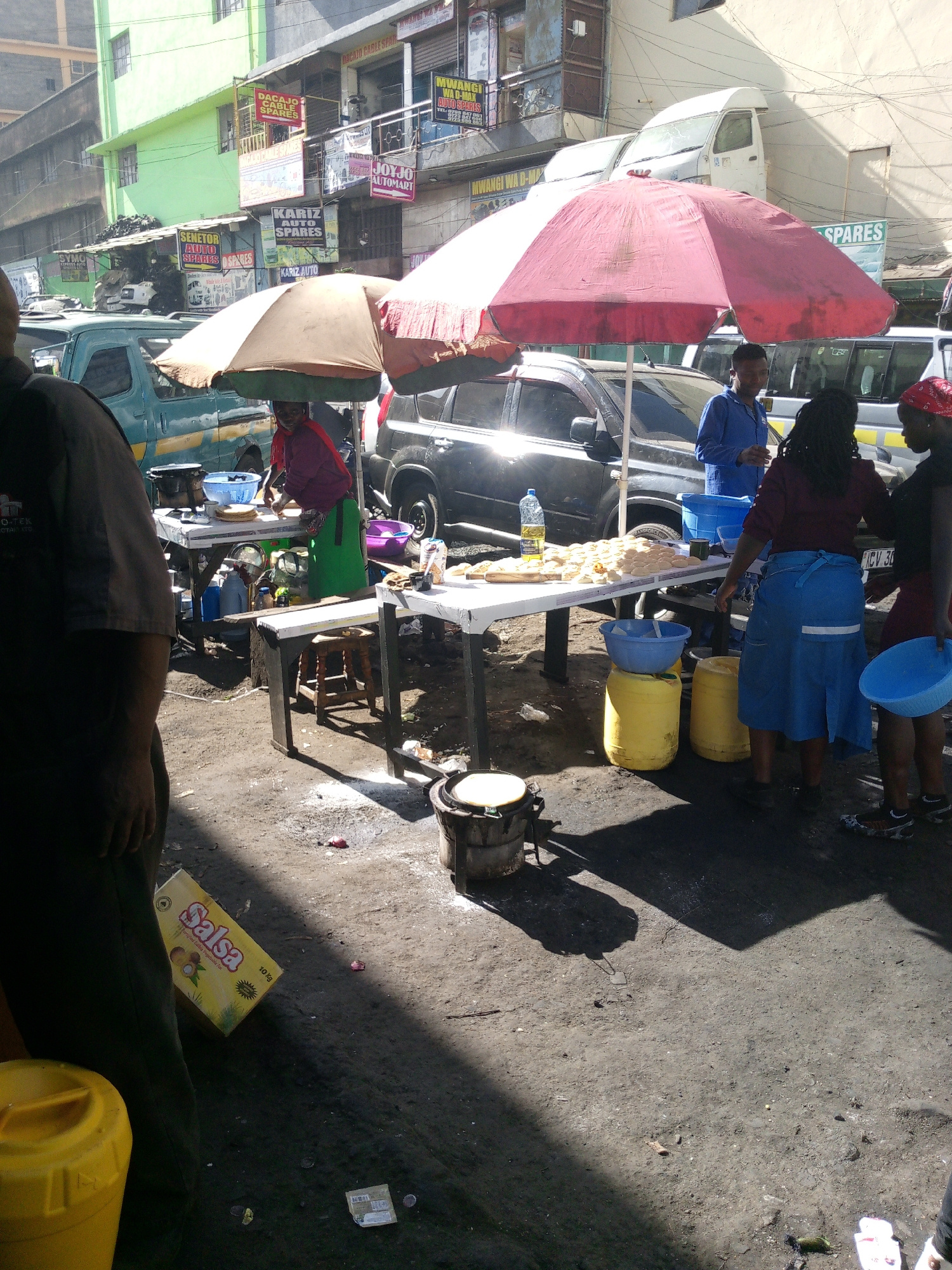 Here's a detailed description of the image: **Scene:** An outdoor food vending setup on a street in Nairobi, Kenya. The ground is dirt and asphalt with trash scattered around. **People:** Several in…read more