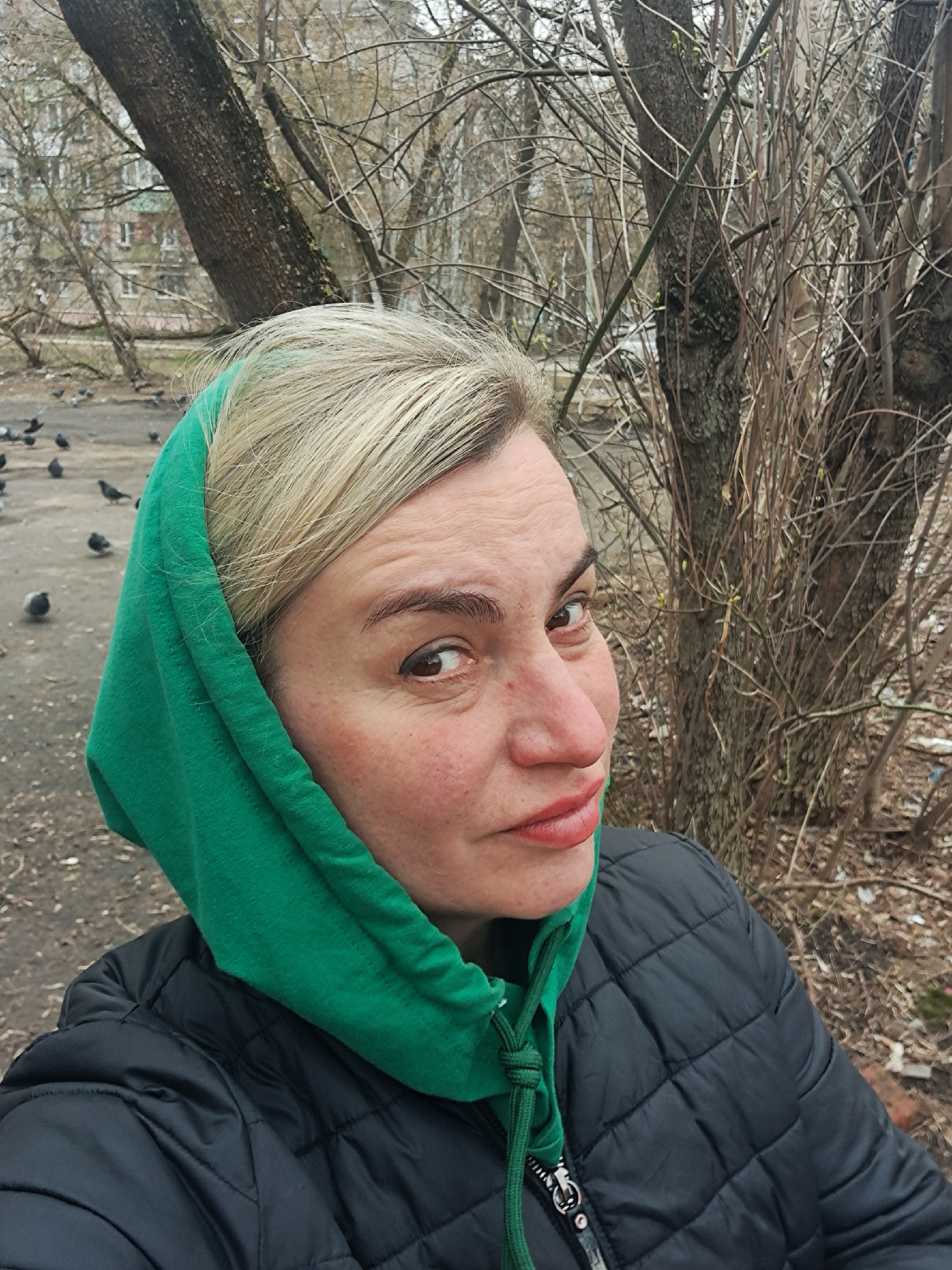 A woman with blonde hair and wearing a green hoodie and black quilted jacket is standing outdoors. The background suggests a park or outdoor area in autumn or early spring, as indicated by the bare tr…read more