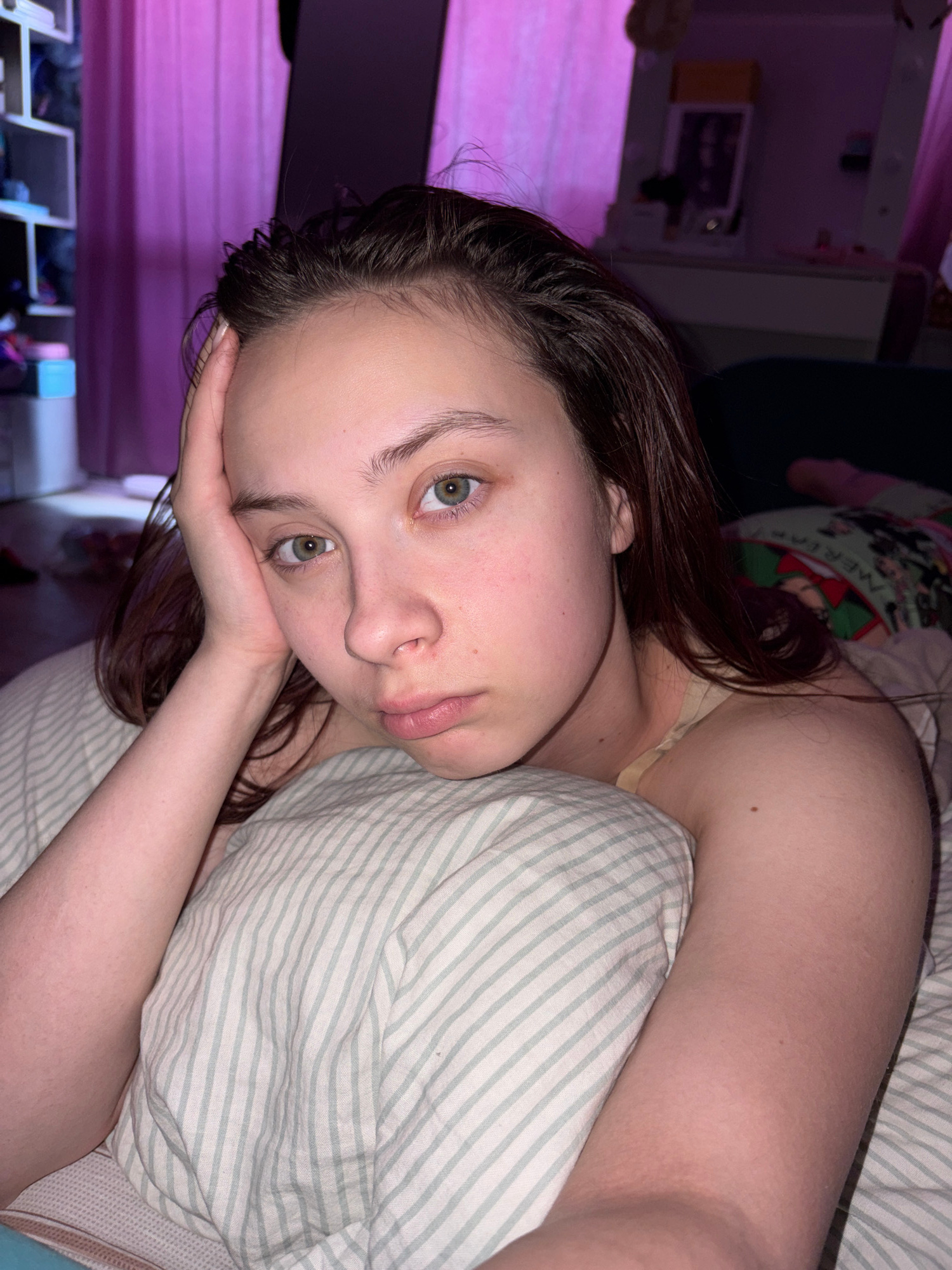 A young adult woman with fair skin and shoulder-length brown hair is lying down, resting her head on her hand. She has light green eyes and a neutral expression. She is on a bed covered with a white a…read more