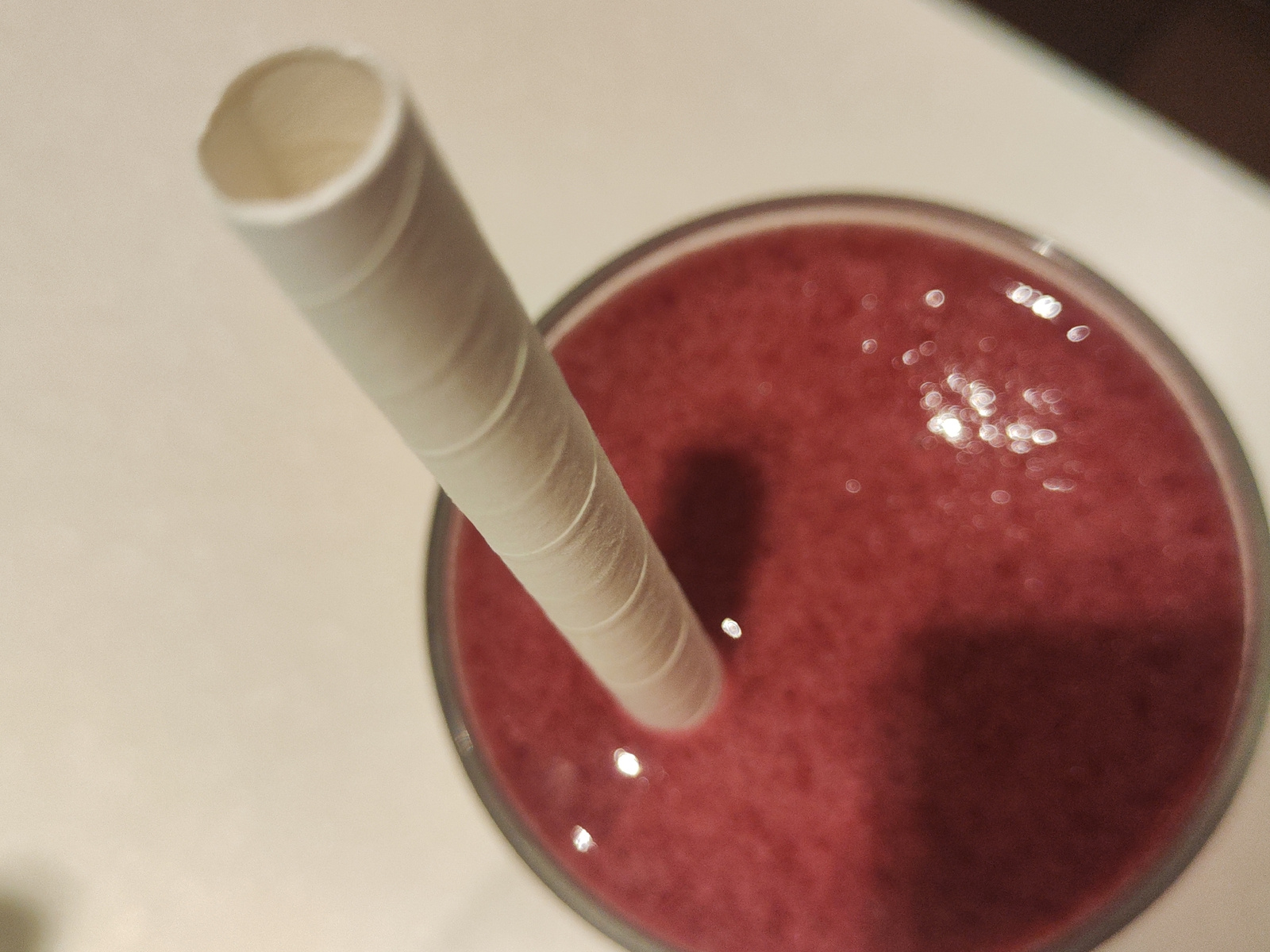 An overhead shot presents a glass filled with a red, viscous liquid, presumably a smoothie, with a white paper straw inserted. The surface of the smoothie exhibits reflective glare. The composition re…read more